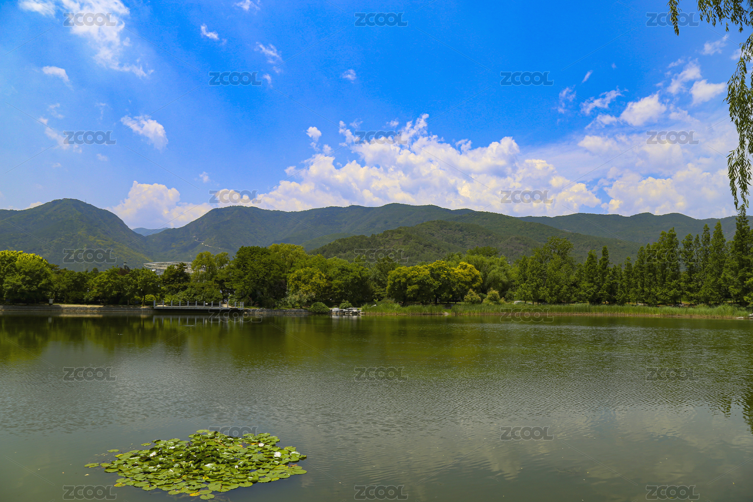 北京植物园春天绿色的树木山峰倒映在湖水中