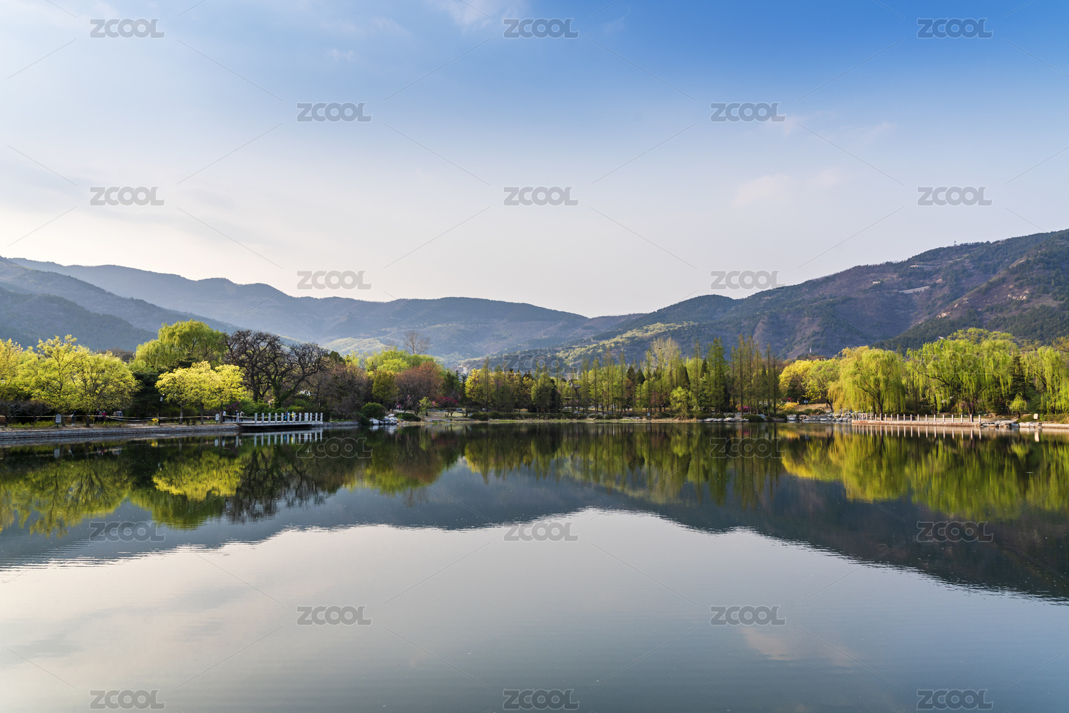 北京植物园春天山峰树木倒映在湖水中