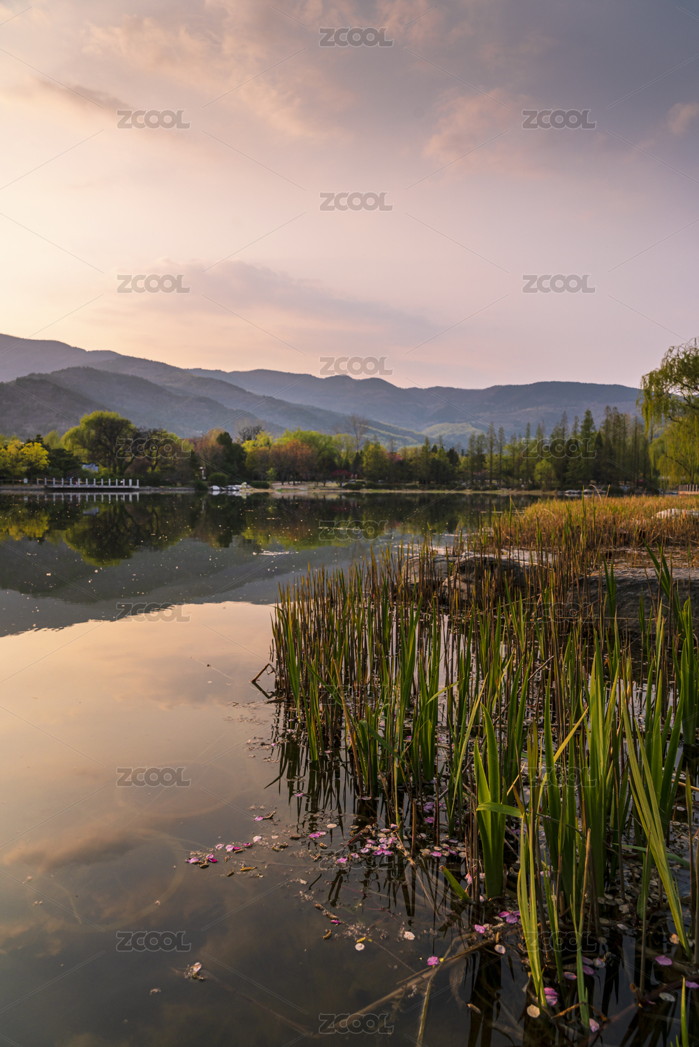 北京植物园春天傍晚树木山峰倒映在湖水中