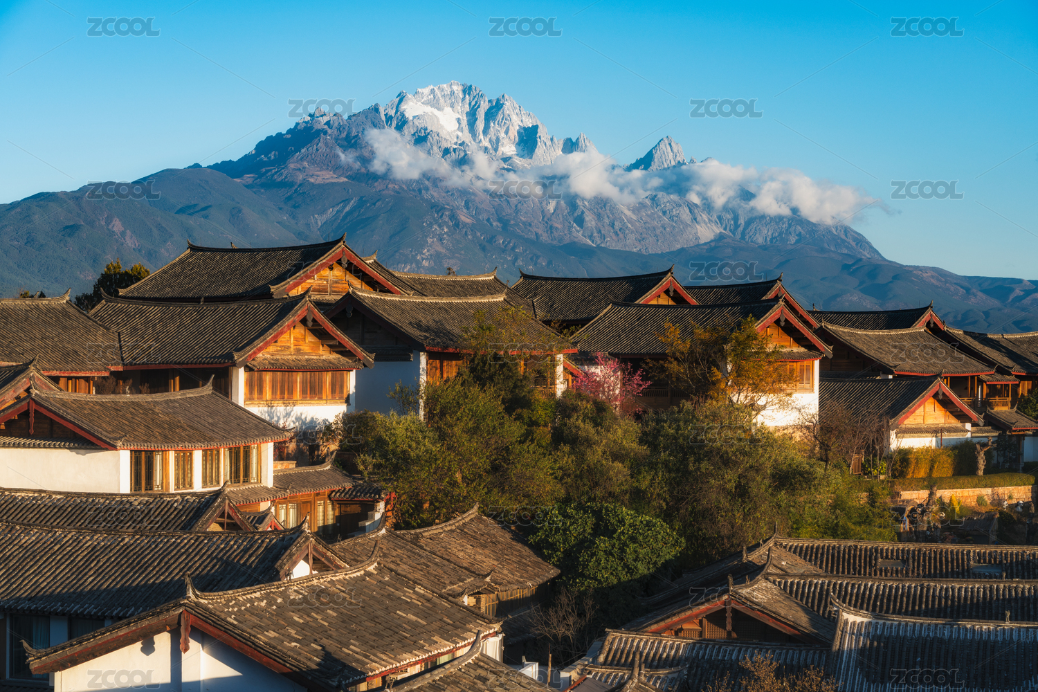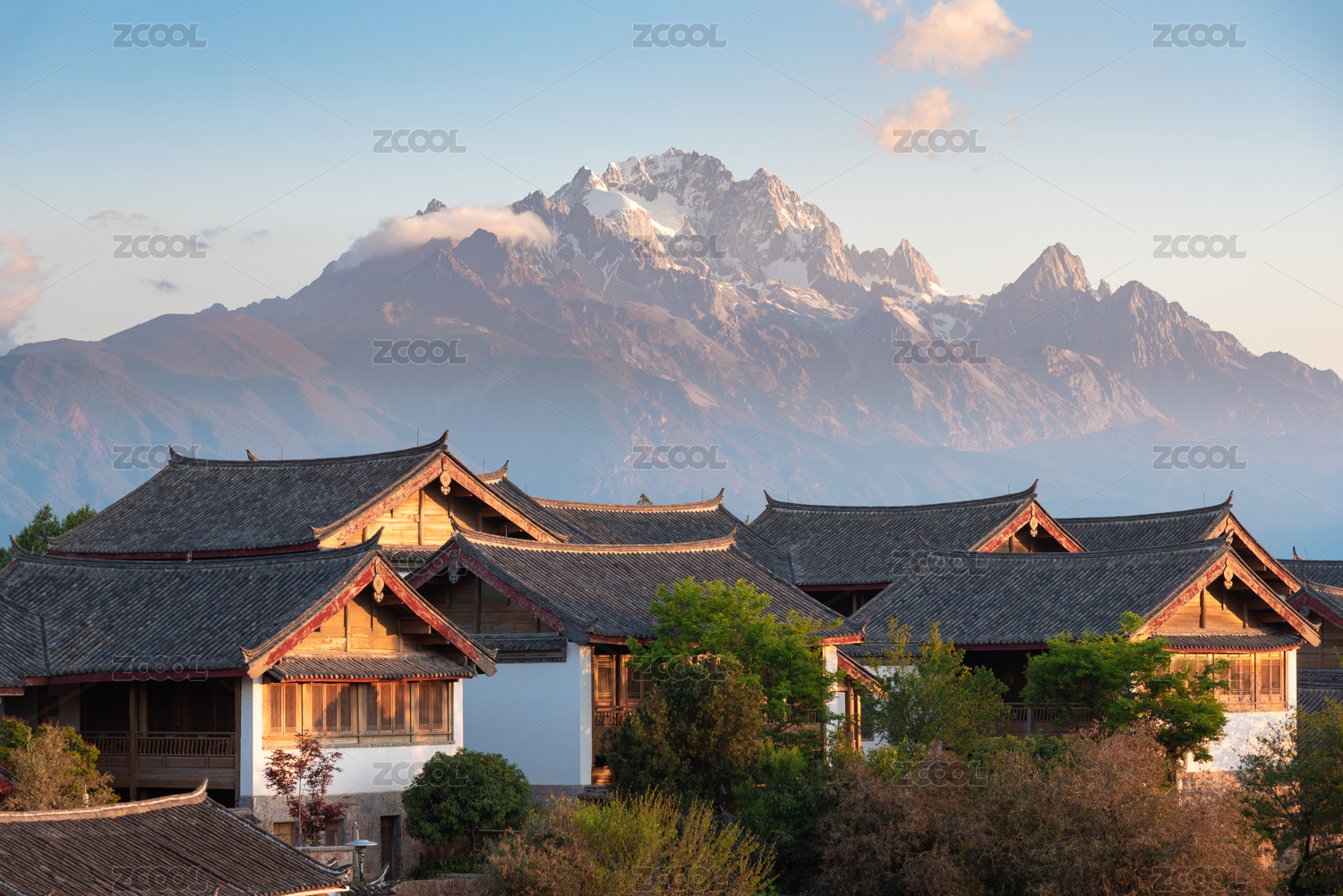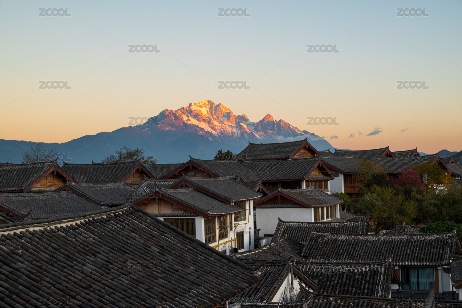 丽江古城屋顶客栈和玉龙雪山日出日照金山