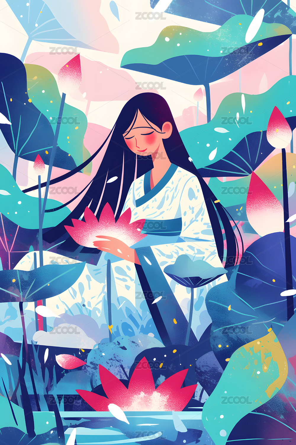 荷花池古风女子插画