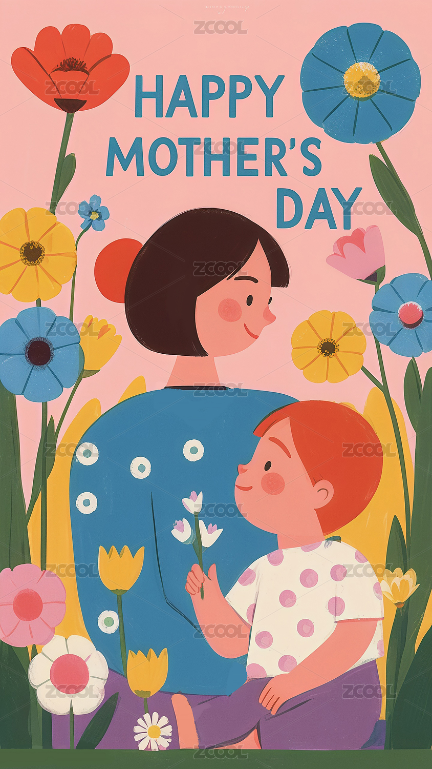 传统节日母亲节 年轻妈妈和儿子在花丛中