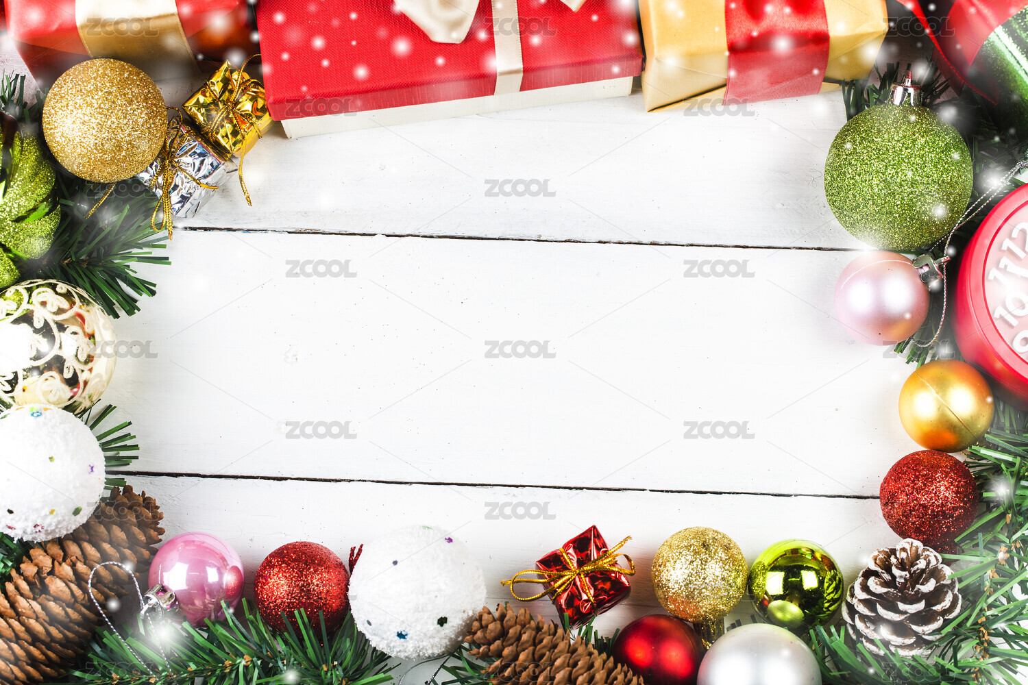 圣诞节装饰品,圣诞礼盒和圣诞球,圣诞树等在白色背景上的俯拍镜头