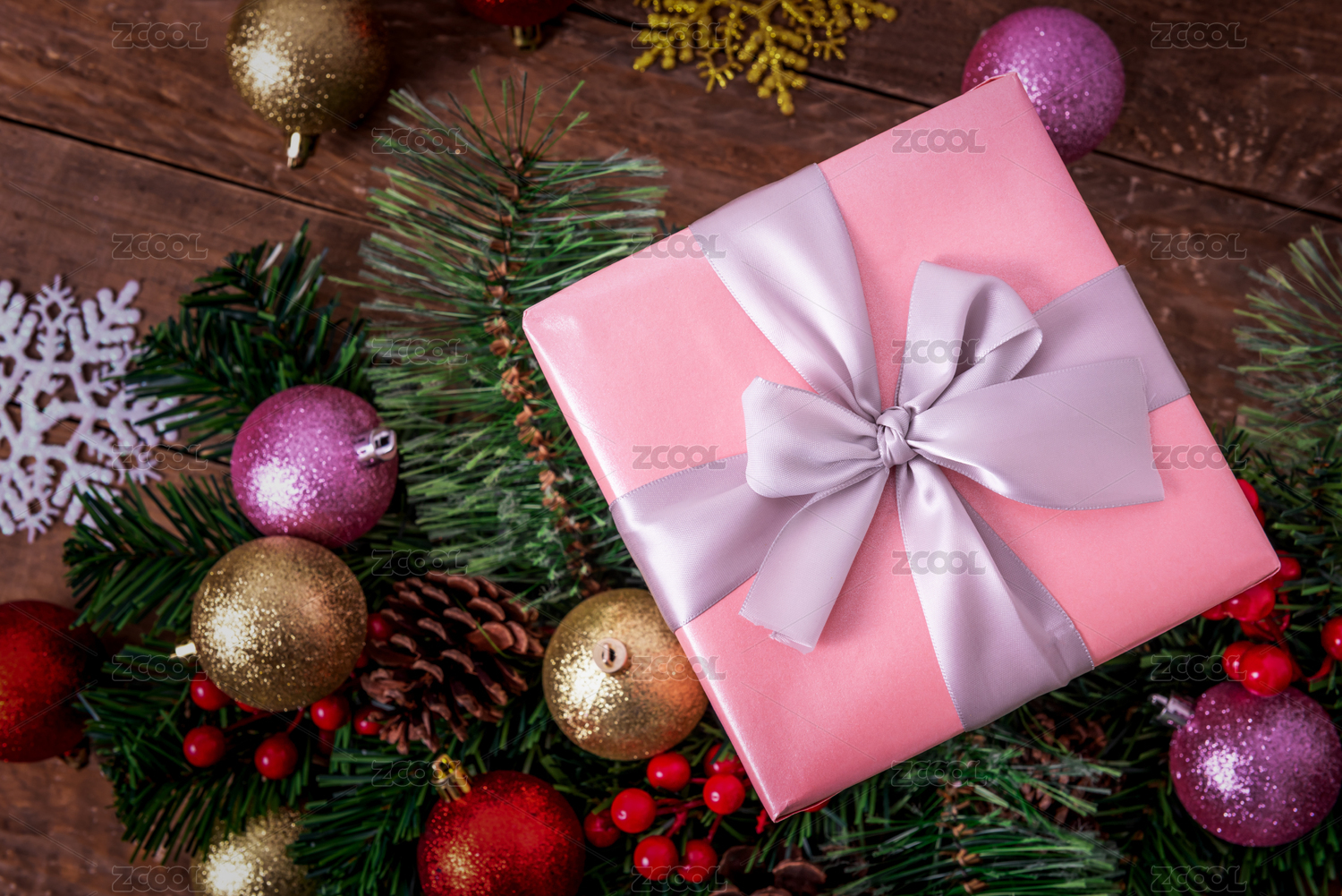美丽的粉红色礼物,圣诞节装饰品,粉色礼盒,圣诞树,圣诞球和松果在桌子上,俯视图