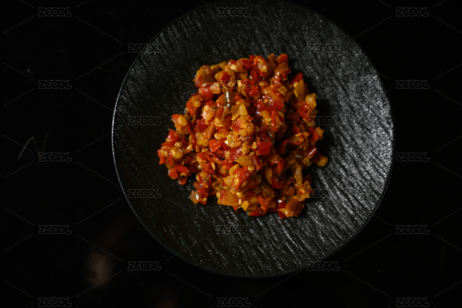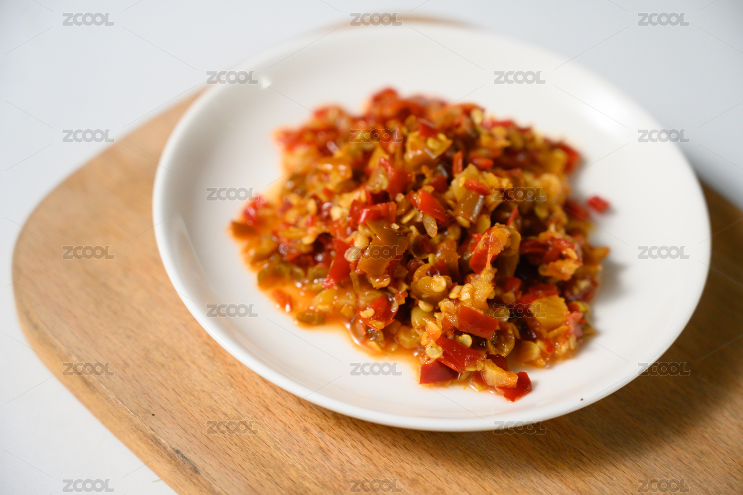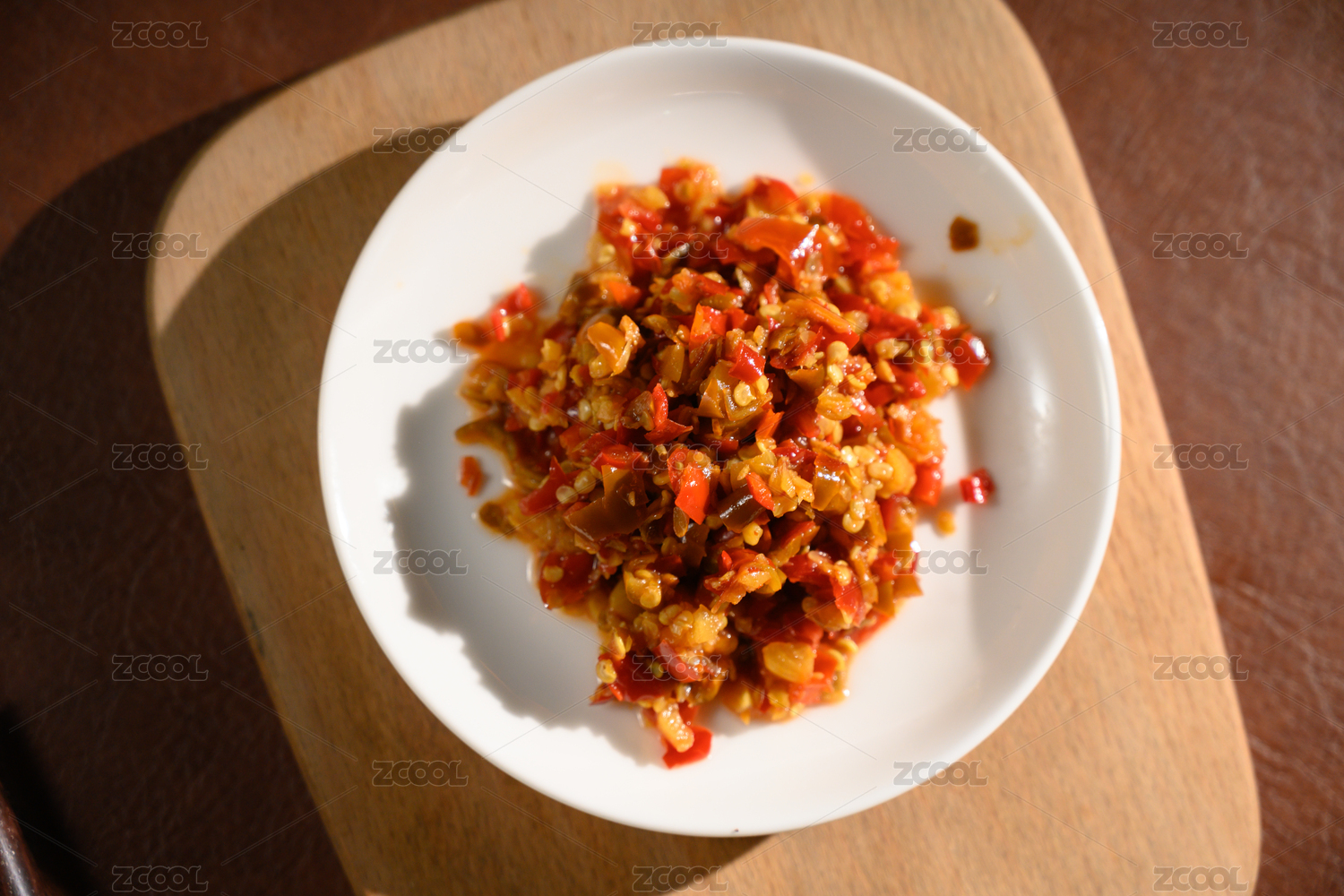 桌面上的盘子里的美味可口的擂椒皮蛋酱