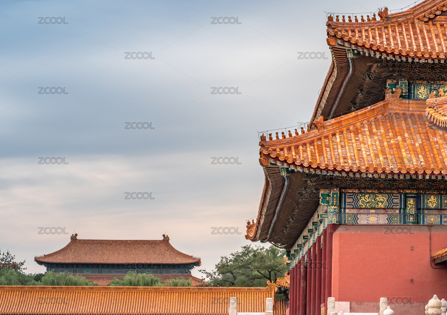 中国北京故宫红色城墙上的东方古代建筑阁楼