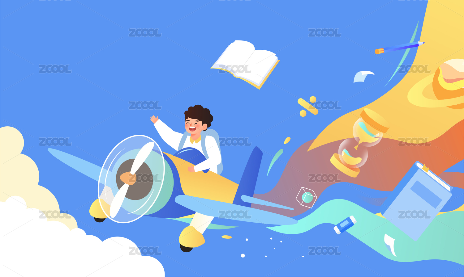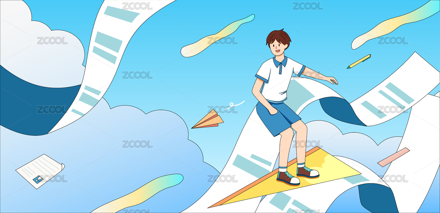 站在三角尺上乘风破浪御风飞行的少年横幅
