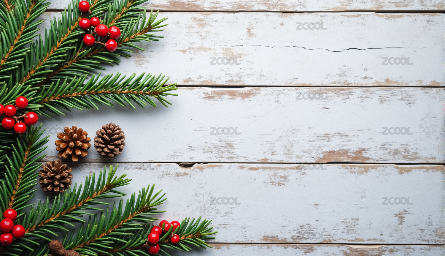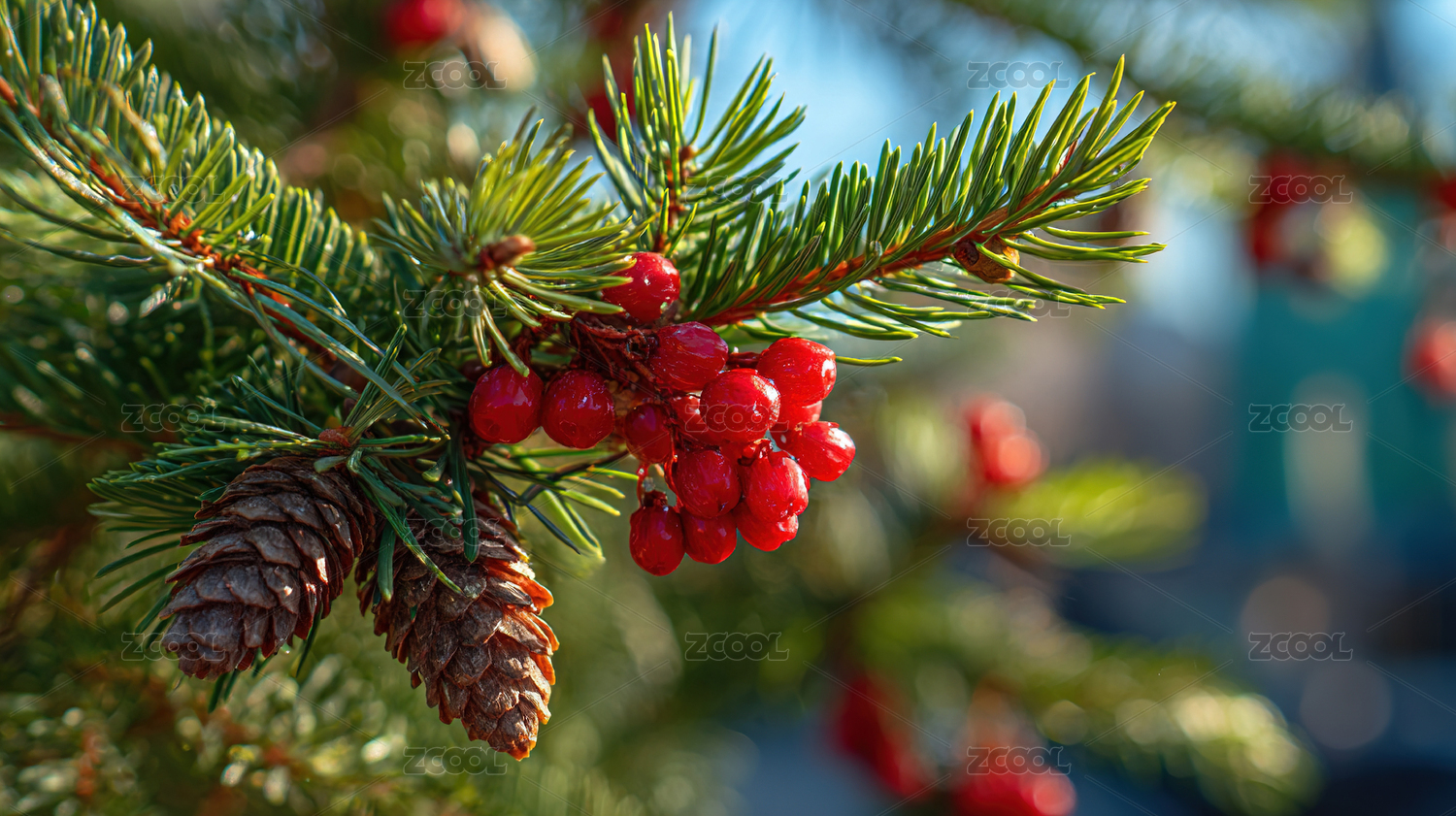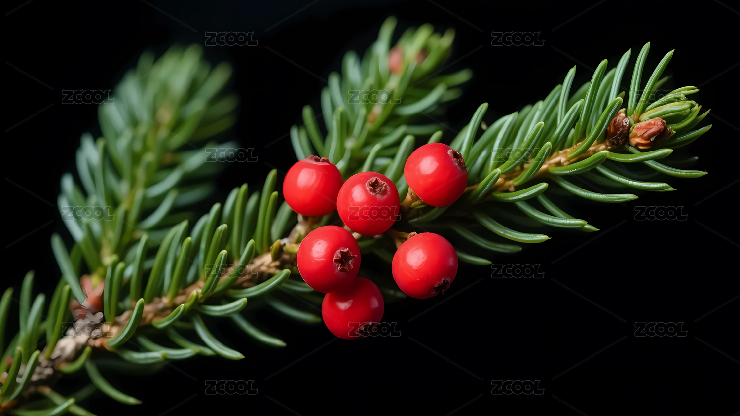 圣诞树枝和红色浆果,圣诞节装饰品背景