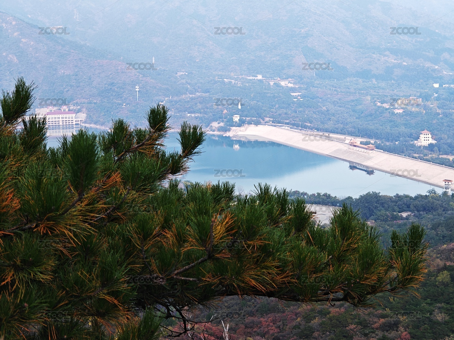 秋日苍松衬托下的十三陵水库大坝