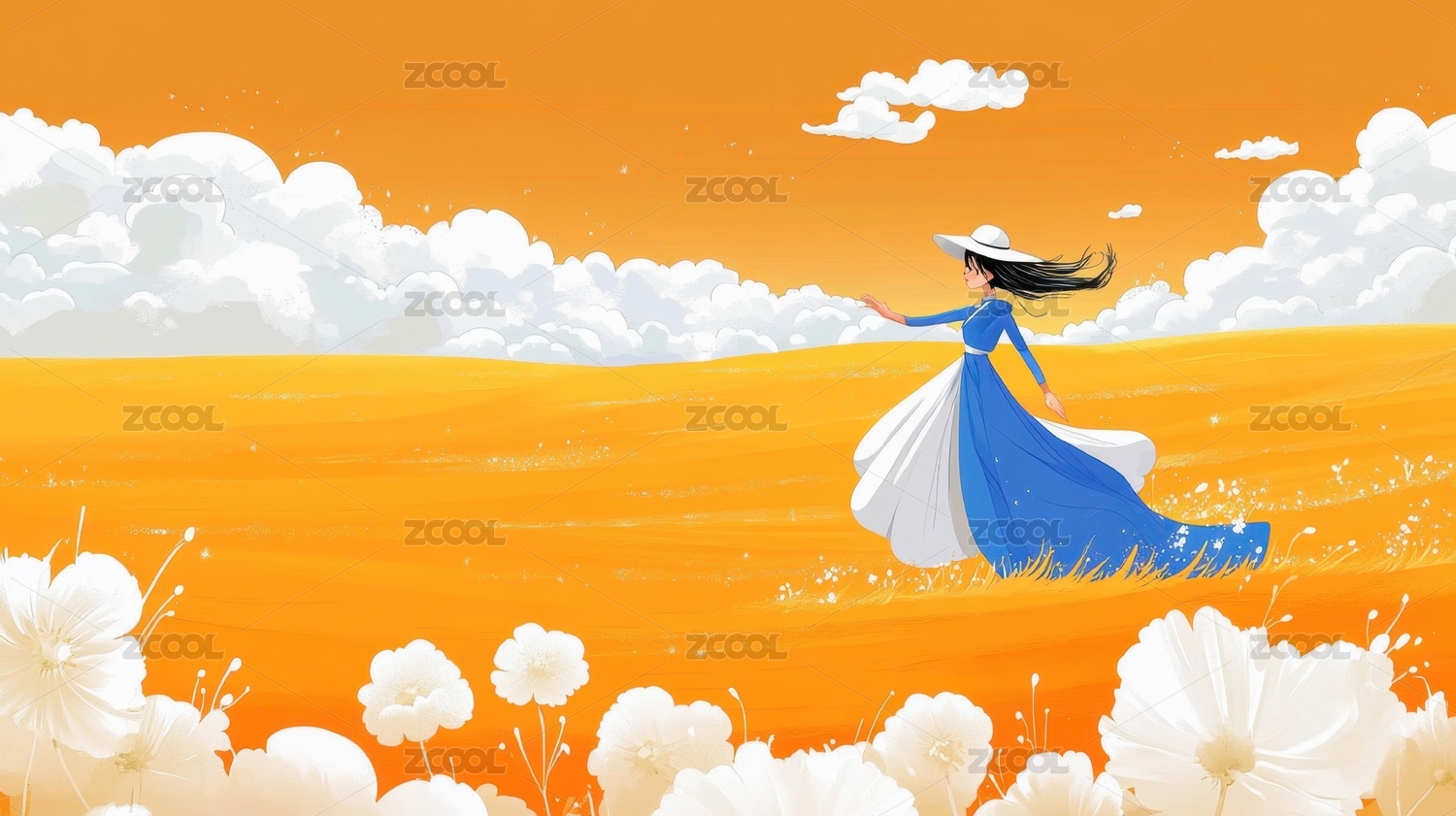 橙色天空下女孩漫步金色花田
