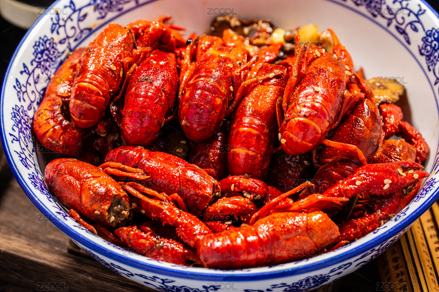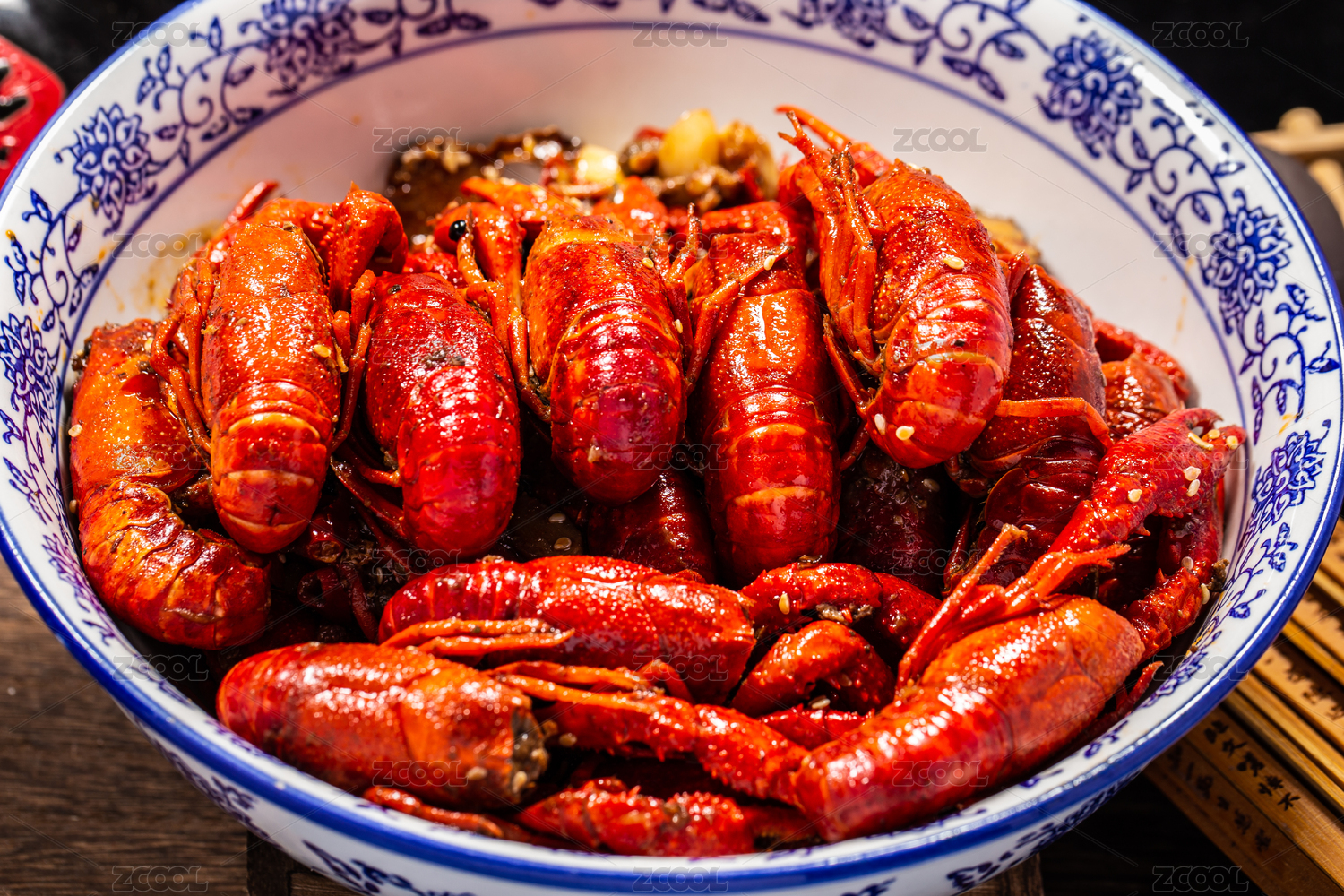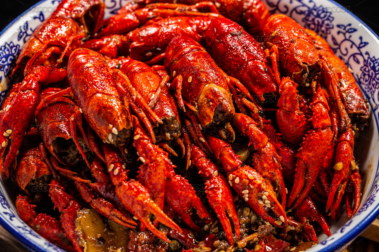 整齐摆盘的麻辣小龙虾盛放在大圆碗里