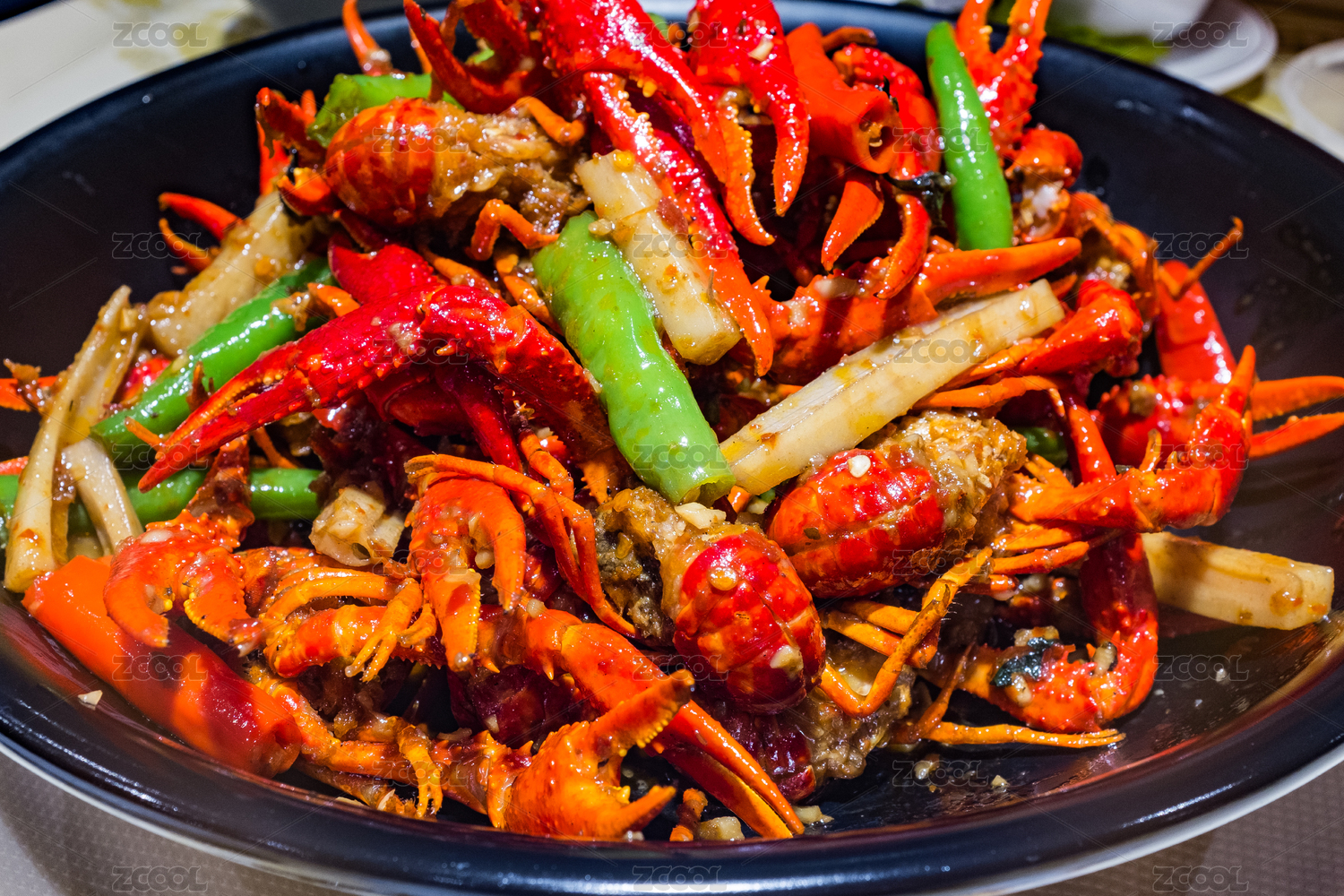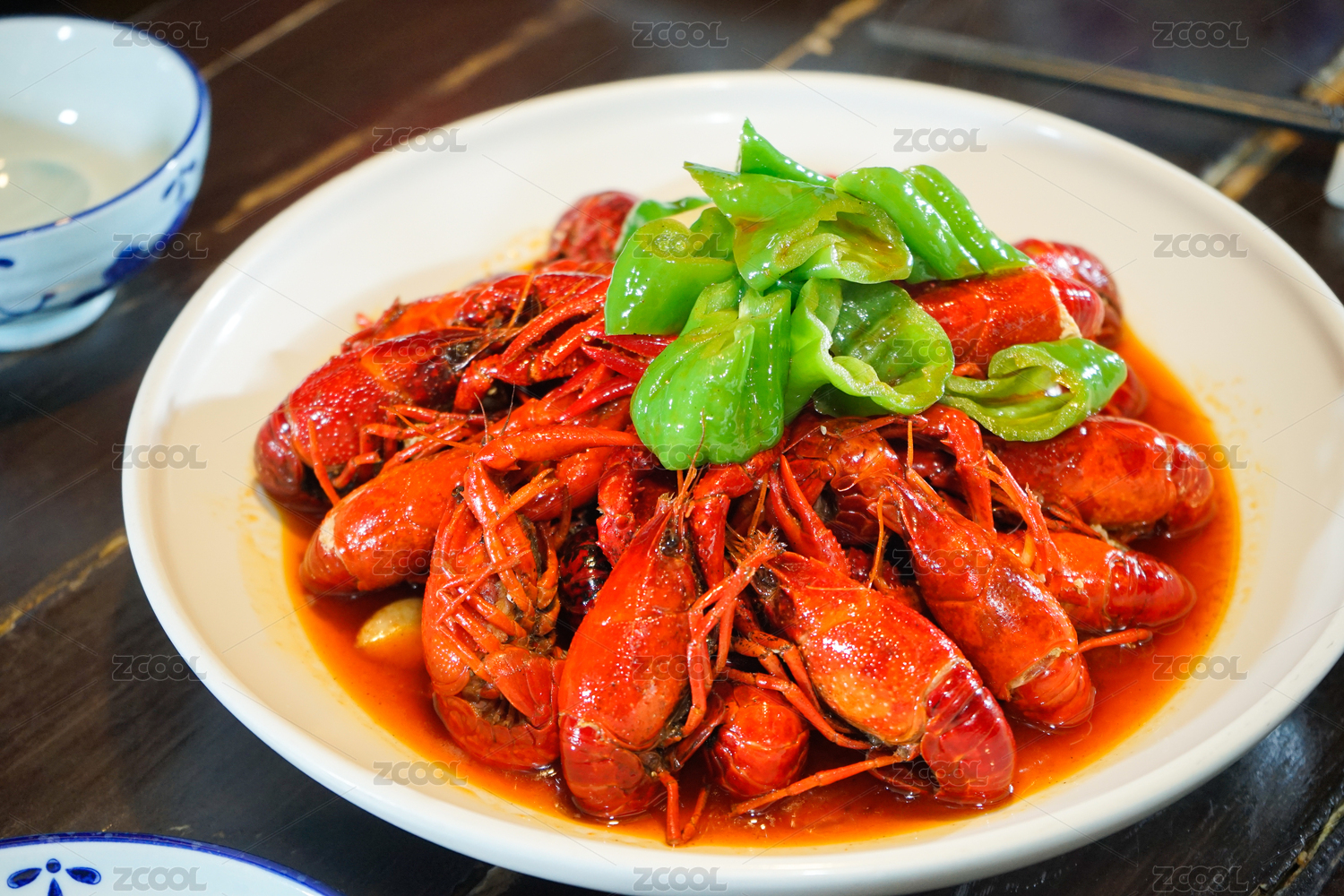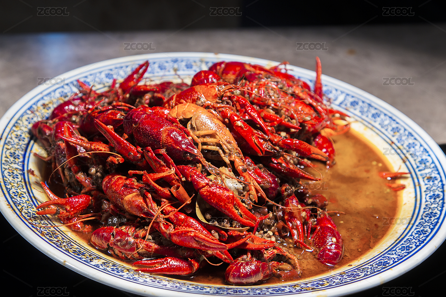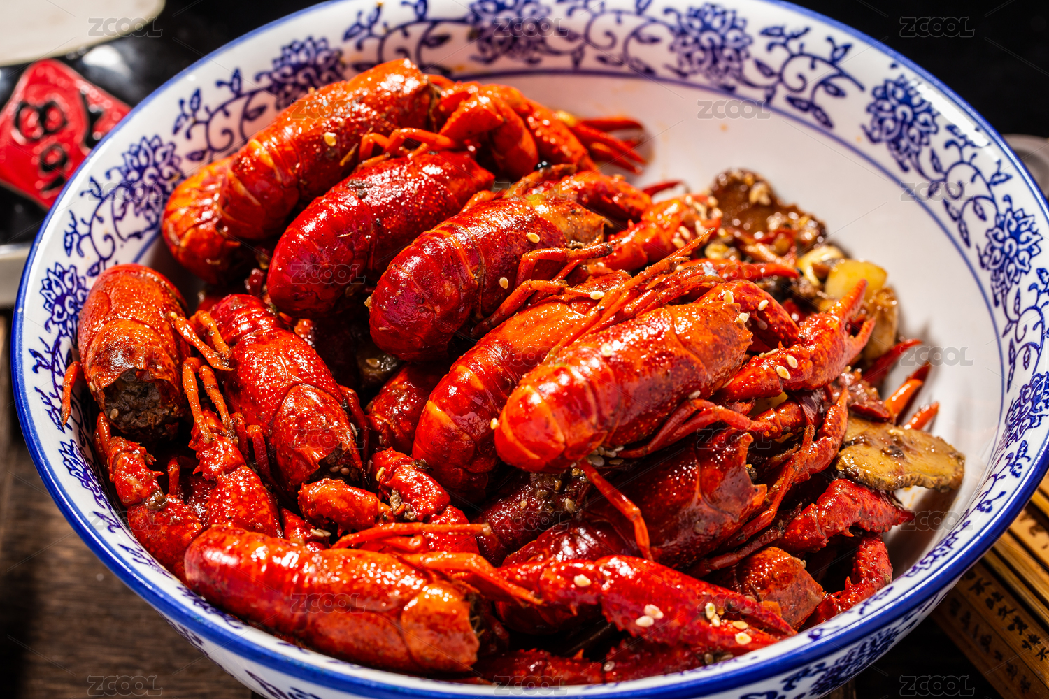 整齐摆盘的麻辣小龙虾盛放在大圆碗里