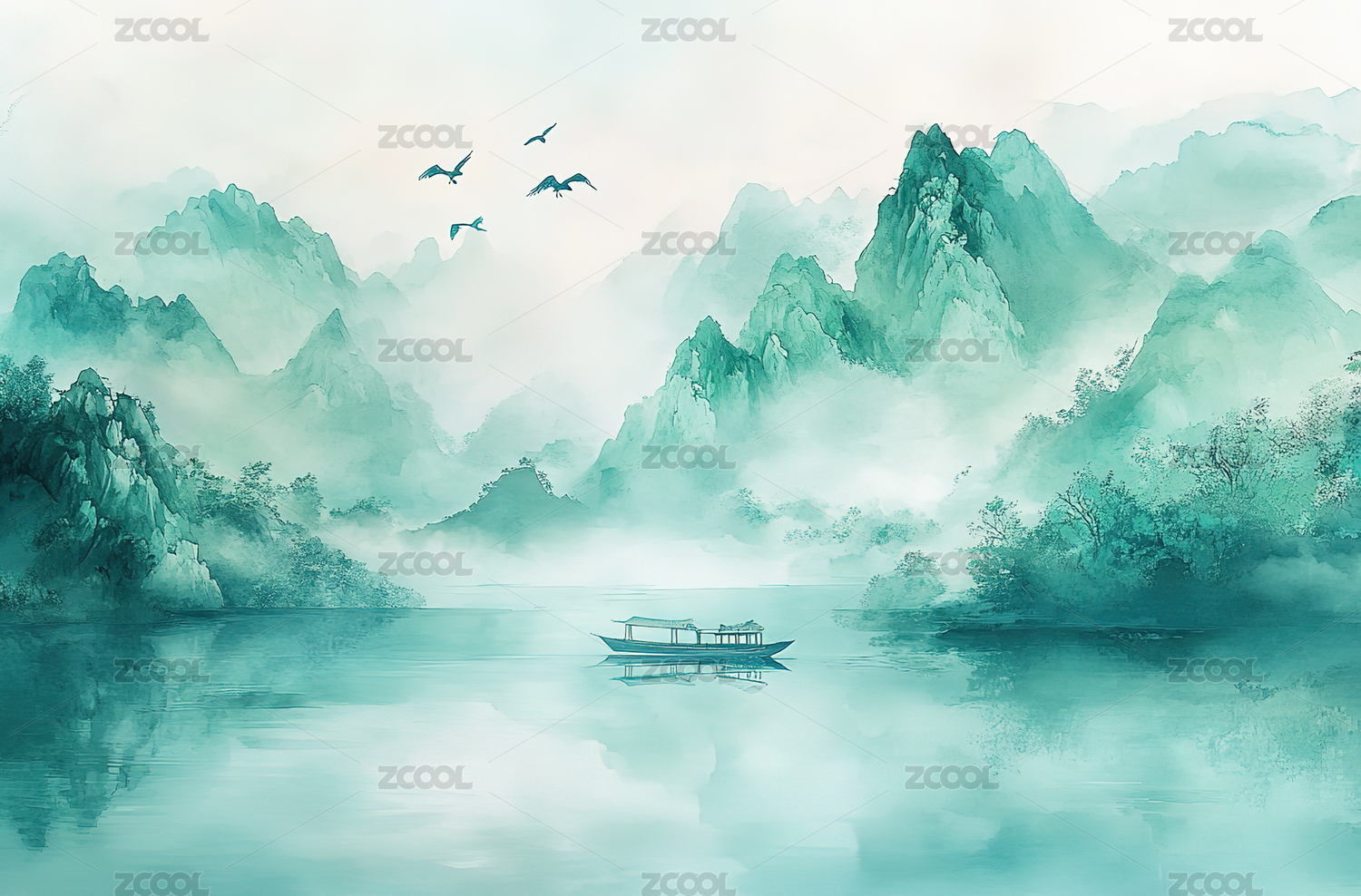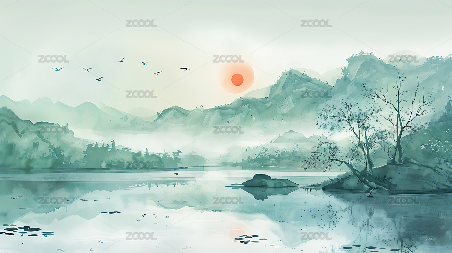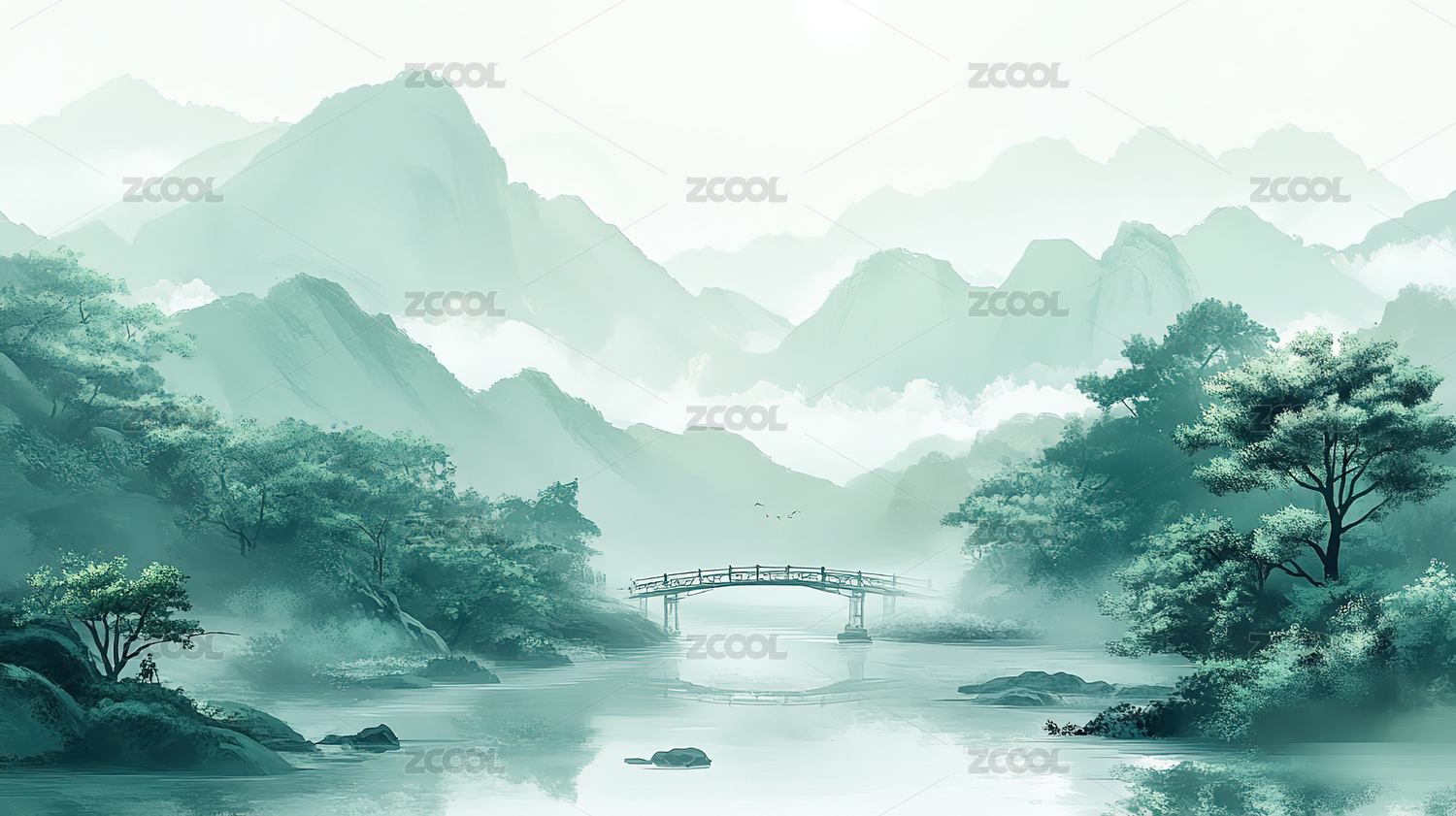 蓝色调的水墨风山水画,水墨风意境山水画概