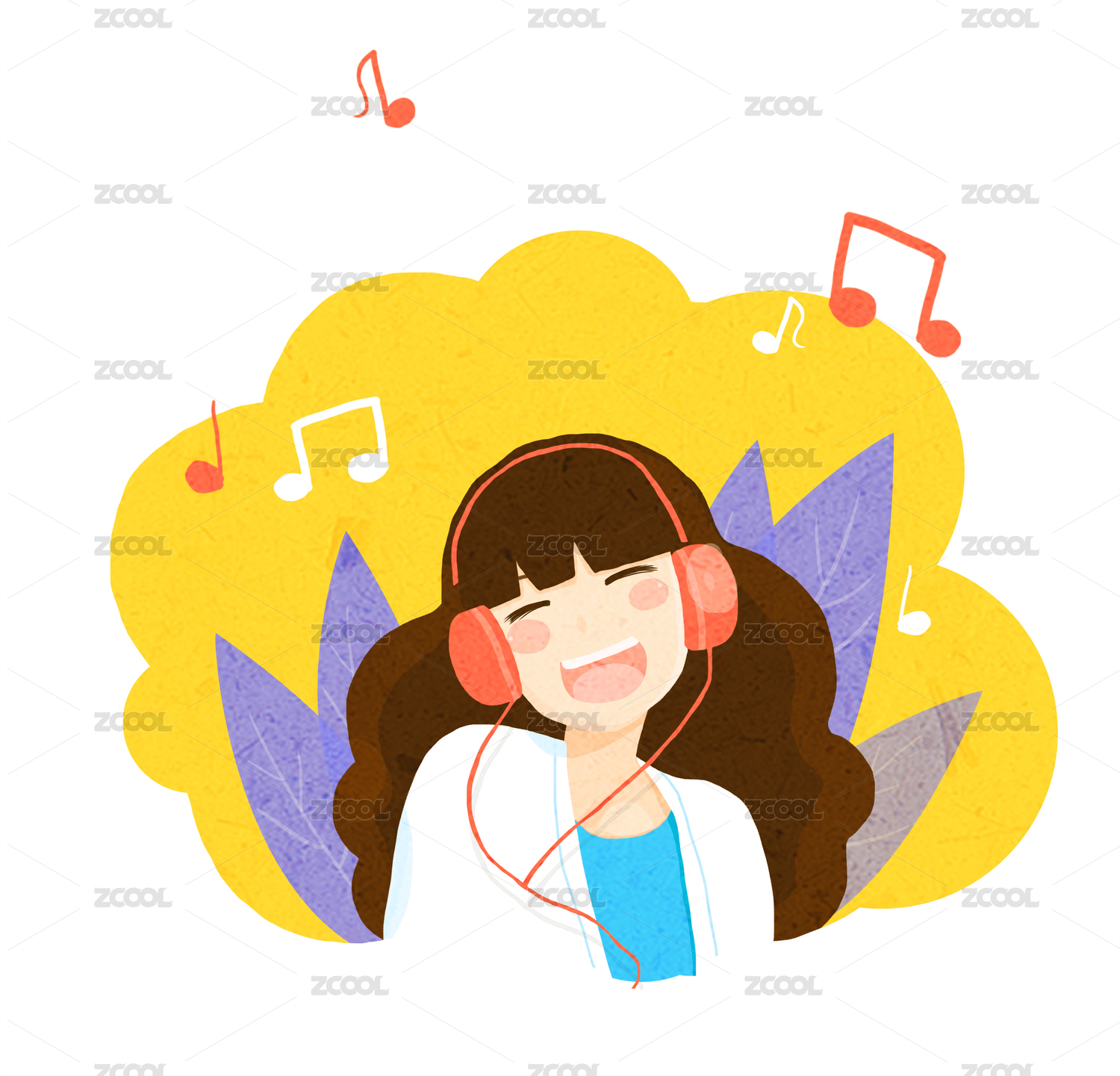 手持话筒唱歌的女孩音乐符号人物形象插画
