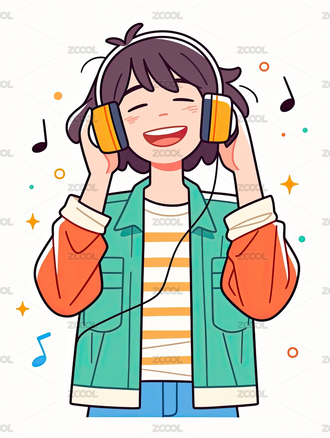开心的带着耳机听音乐的女孩 戴着耳机唱歌的人矢量插画