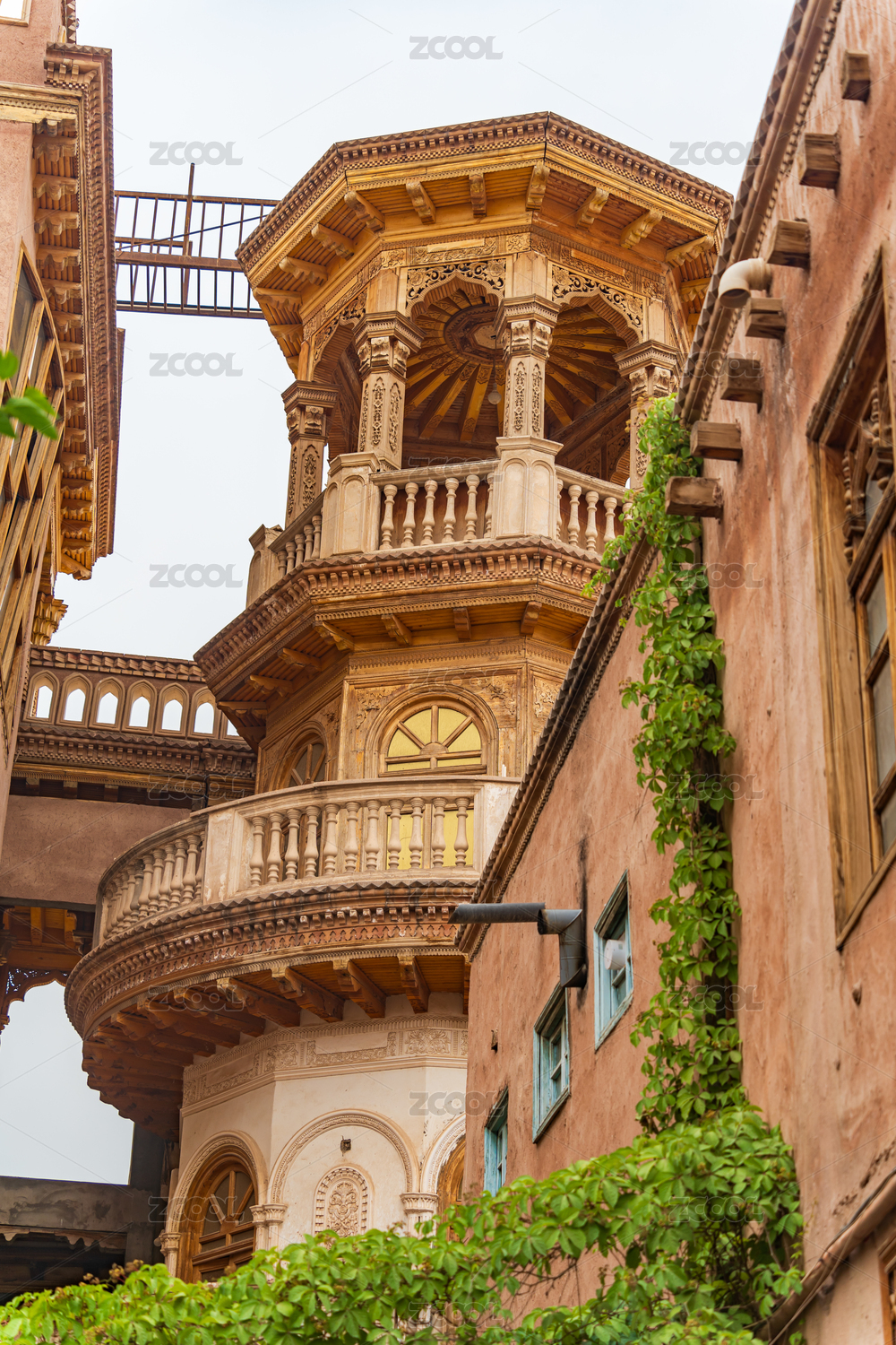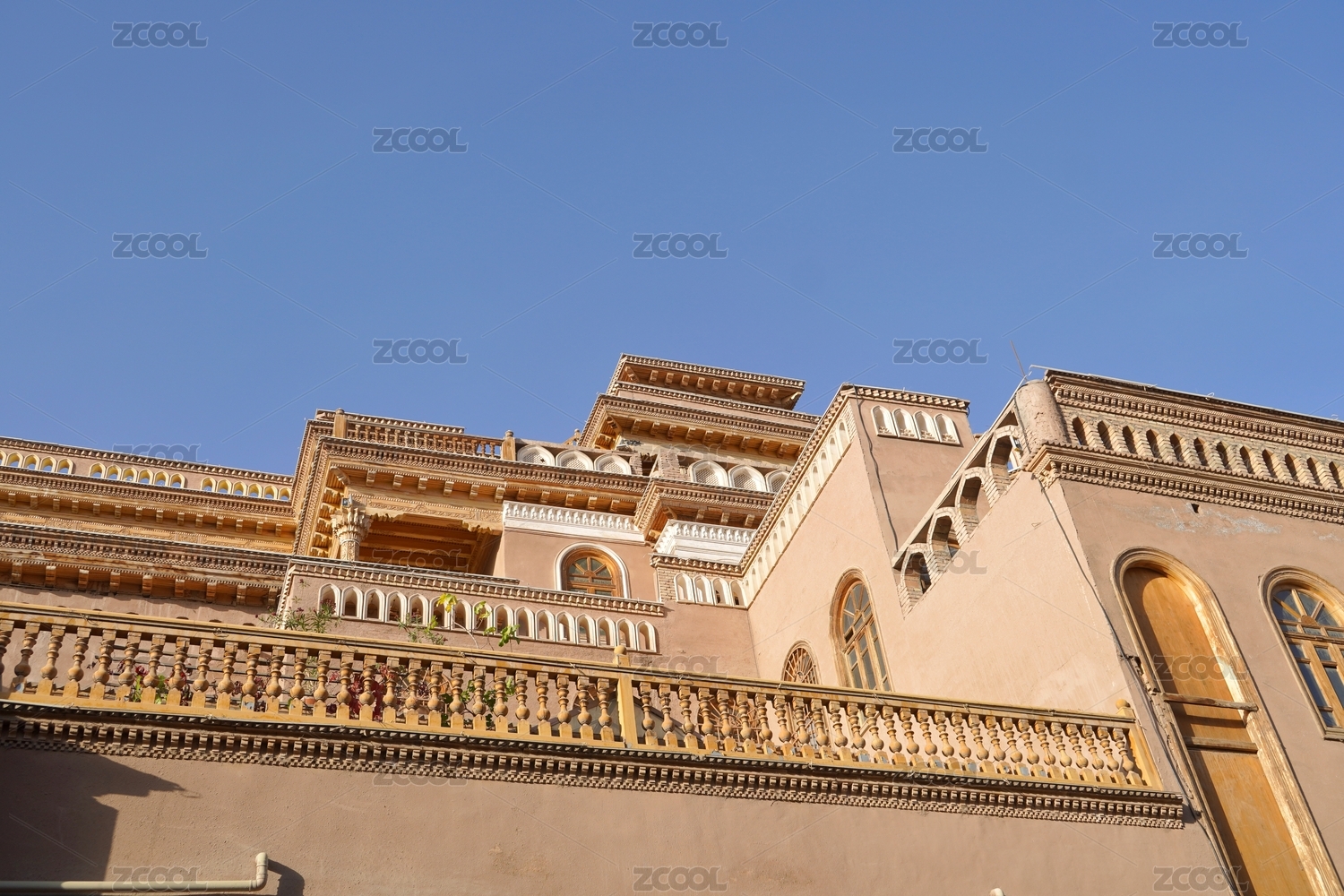 蓝天白云下的中国新疆喀什古城建筑特写镜头