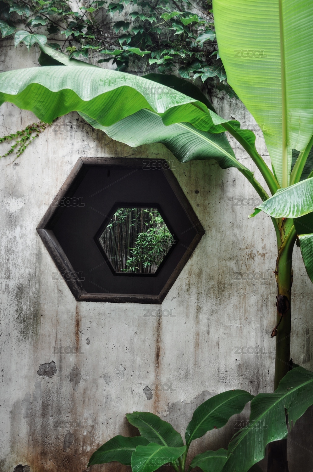 园林窗户里的芭蕉叶