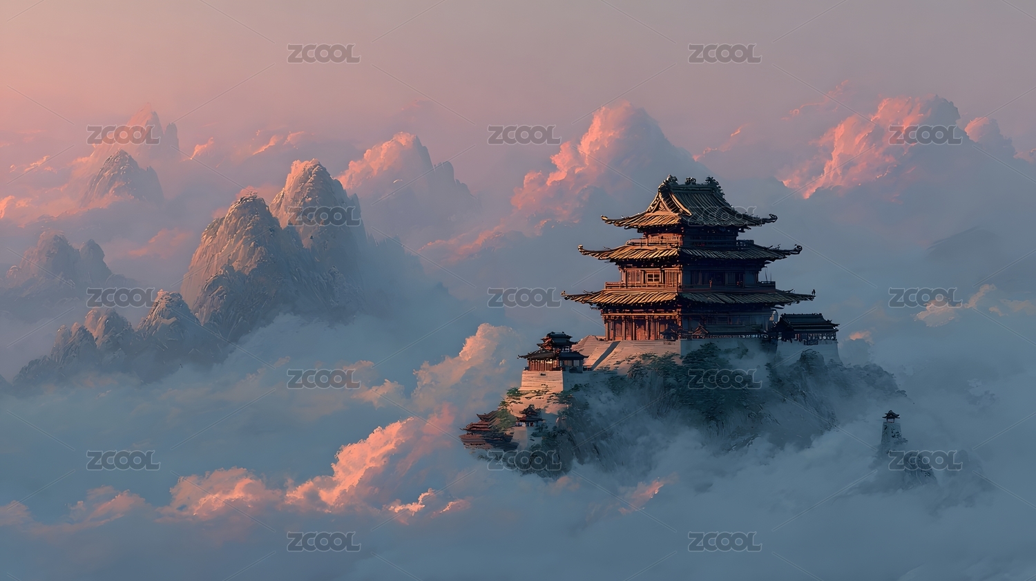 概念艺术,高画质,传统文化,电影感,视觉冲击,僧人,红袍,长城,云雾,古建筑