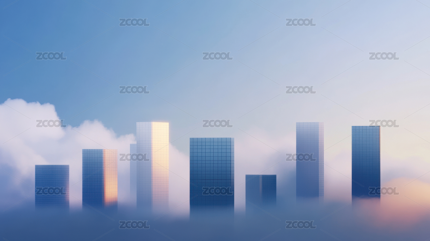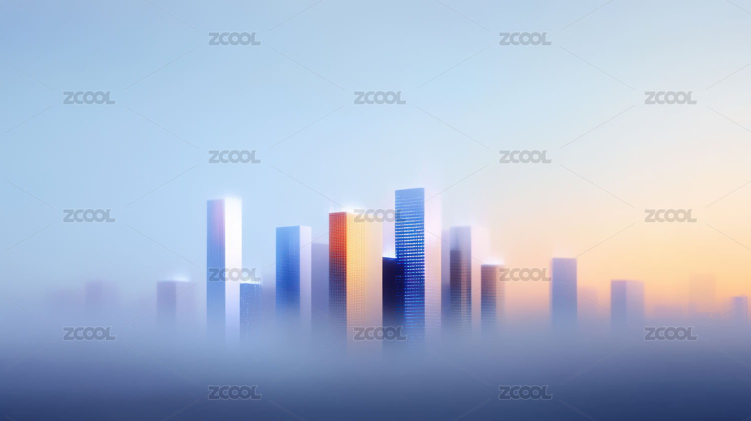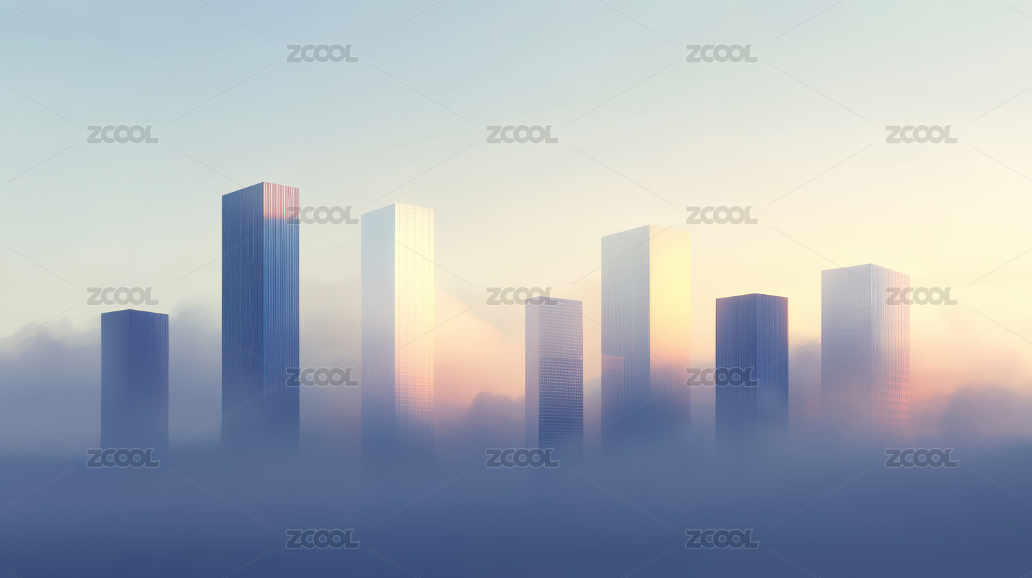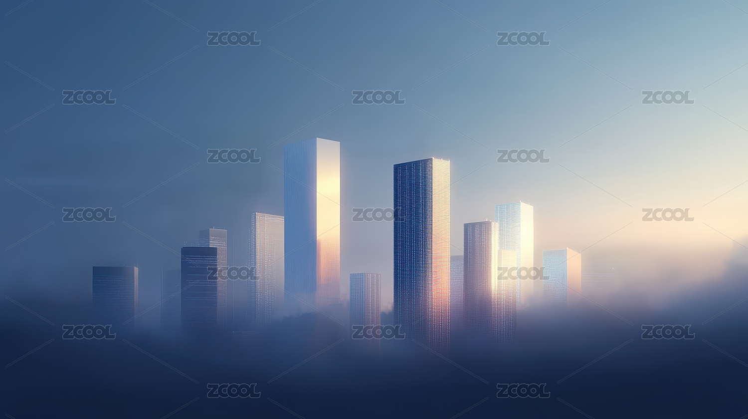 薄雾中阳光洒在摩天高楼上的城市早晨