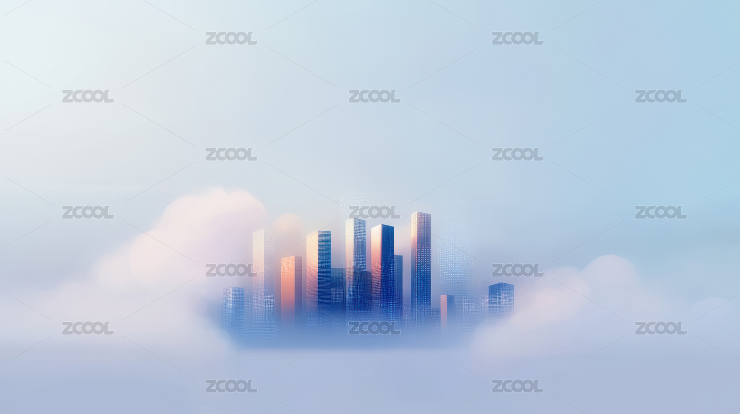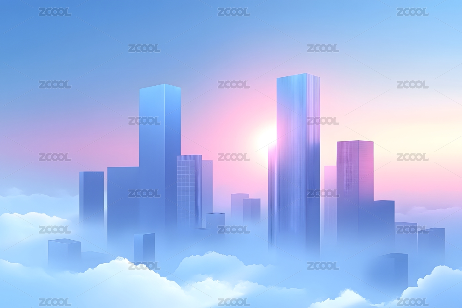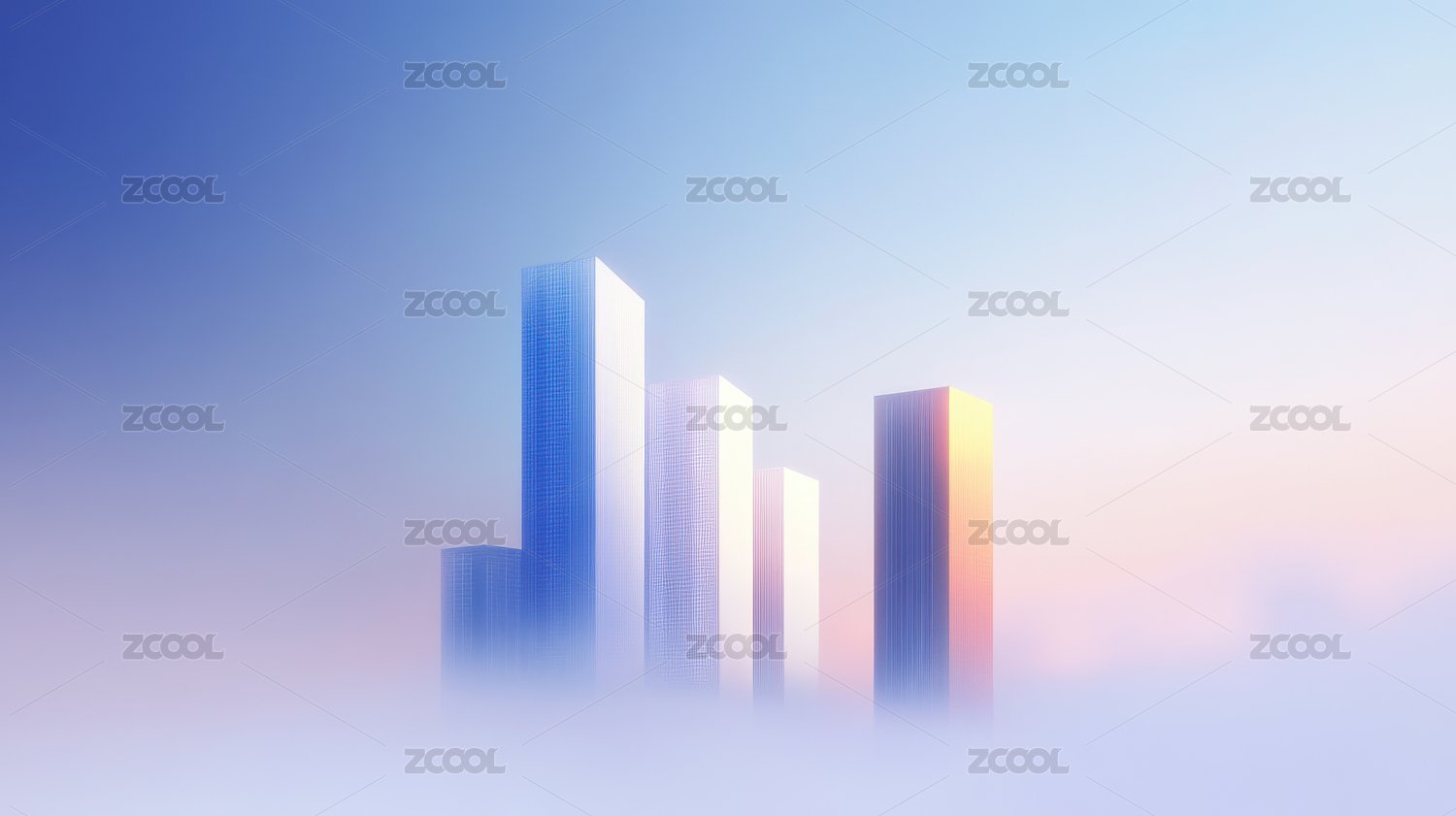 薄雾中阳光洒在摩天高楼上的城市早晨