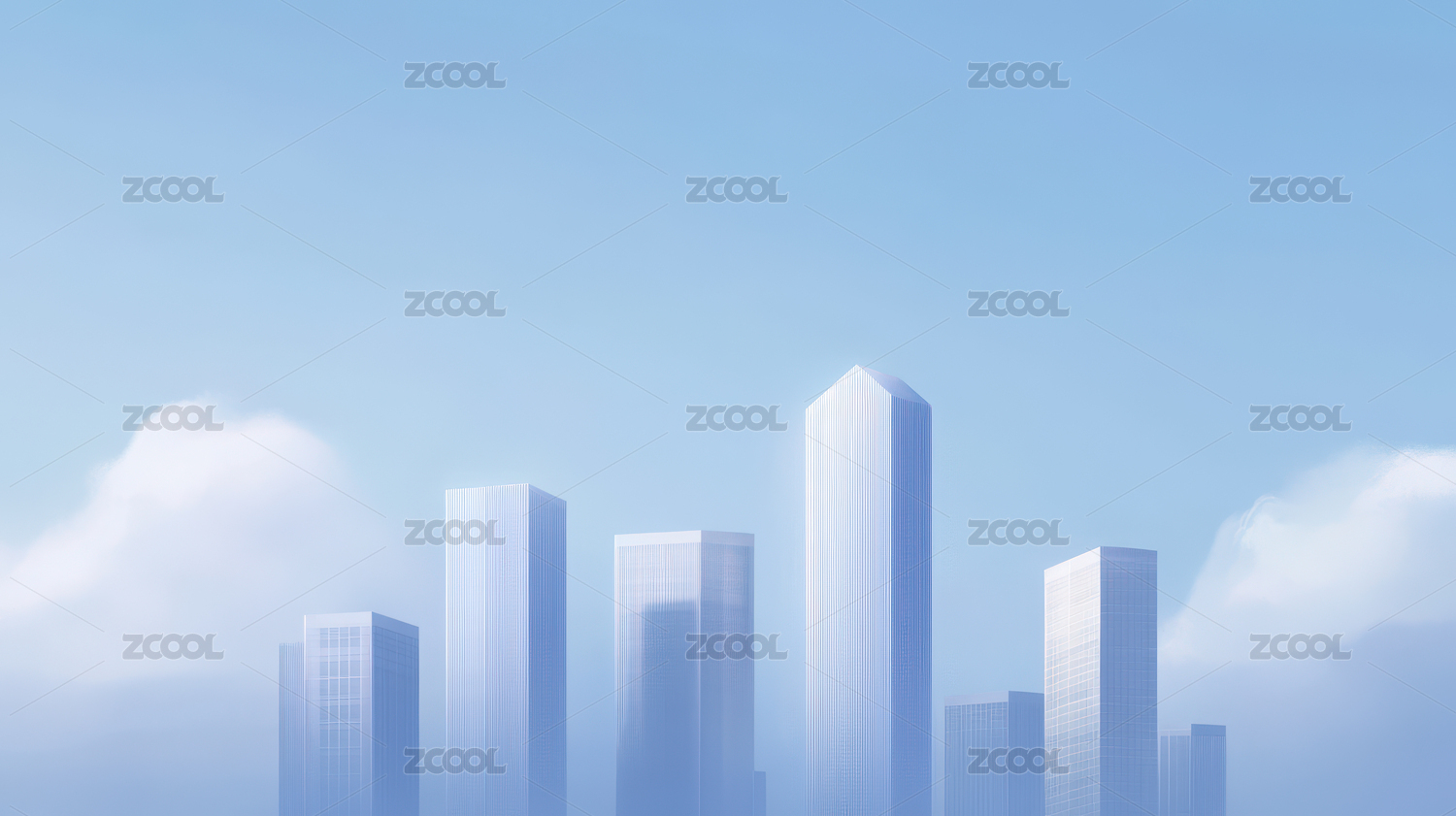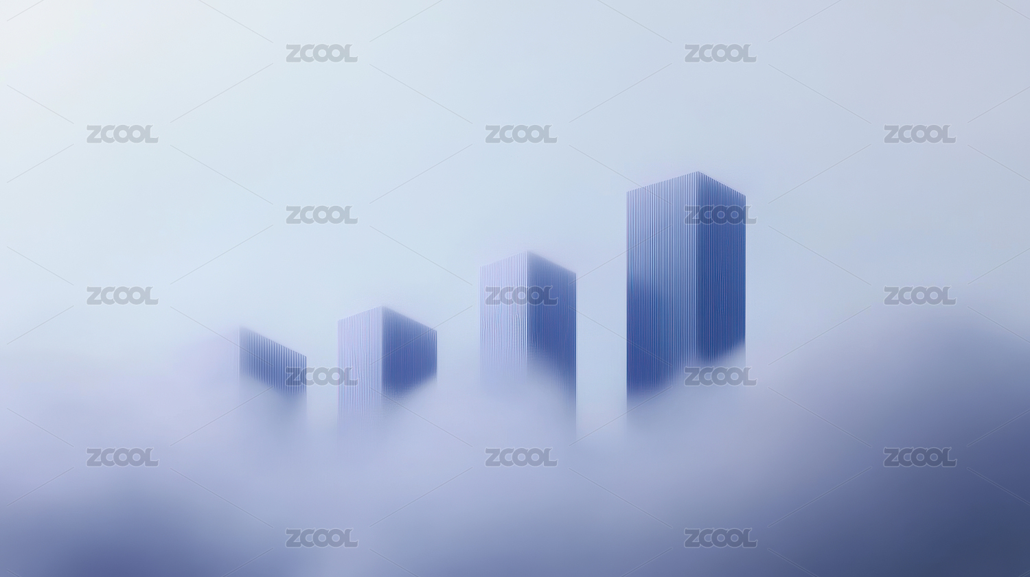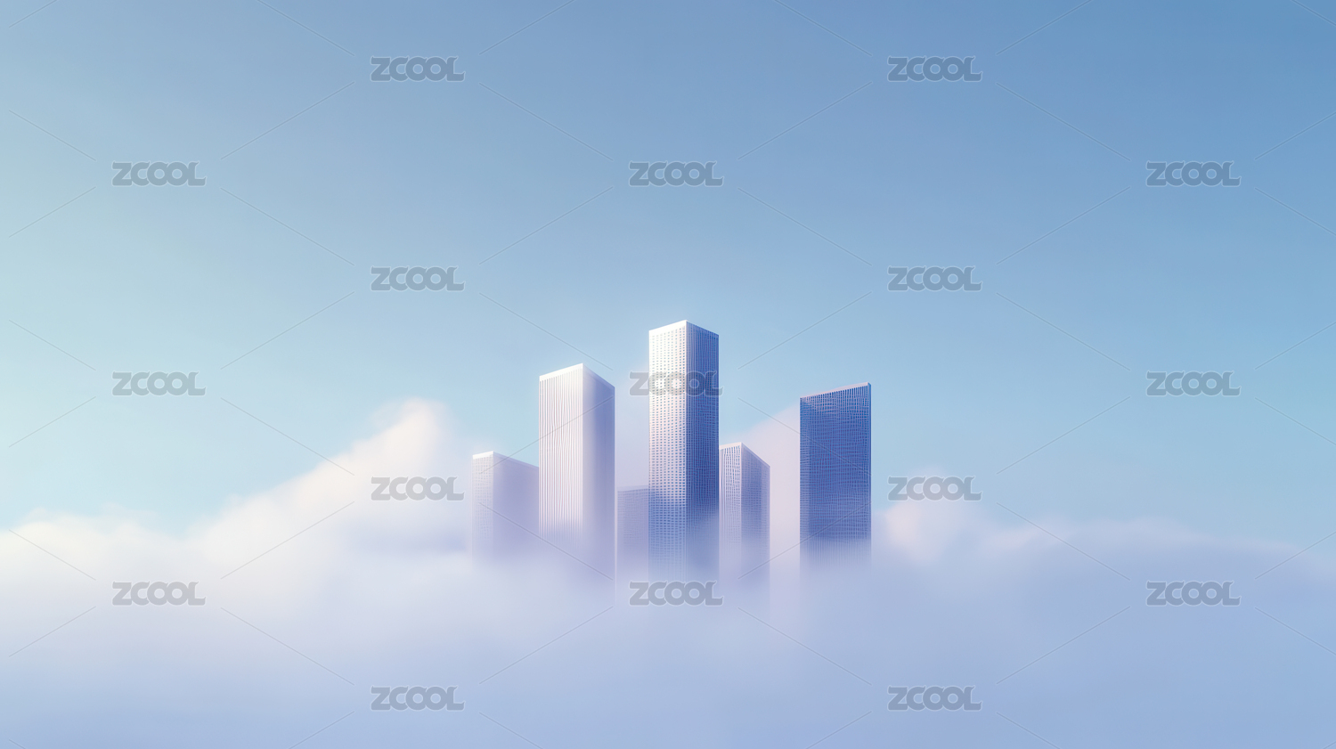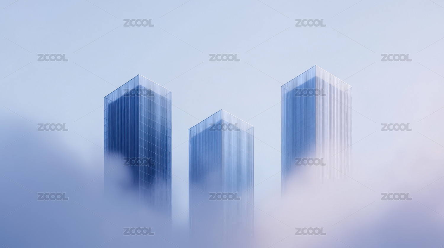 薄雾中阳光洒在摩天高楼上的城市早晨