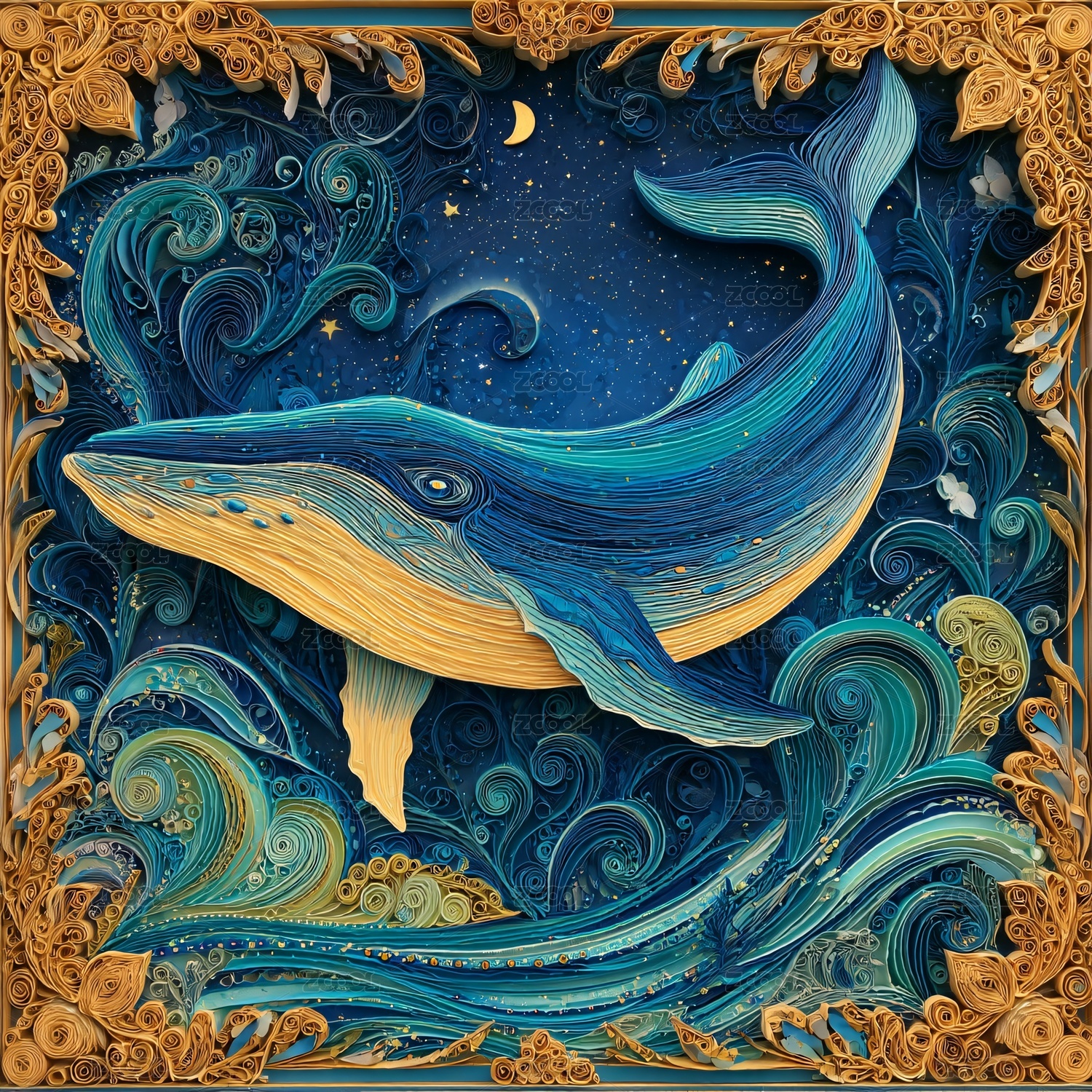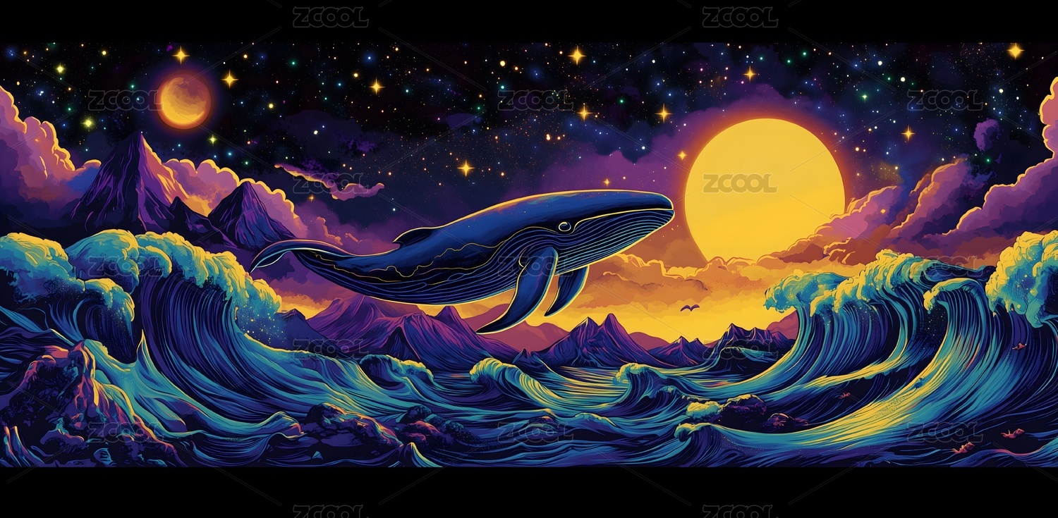 线圈插画月夜下跃起的鲸鱼