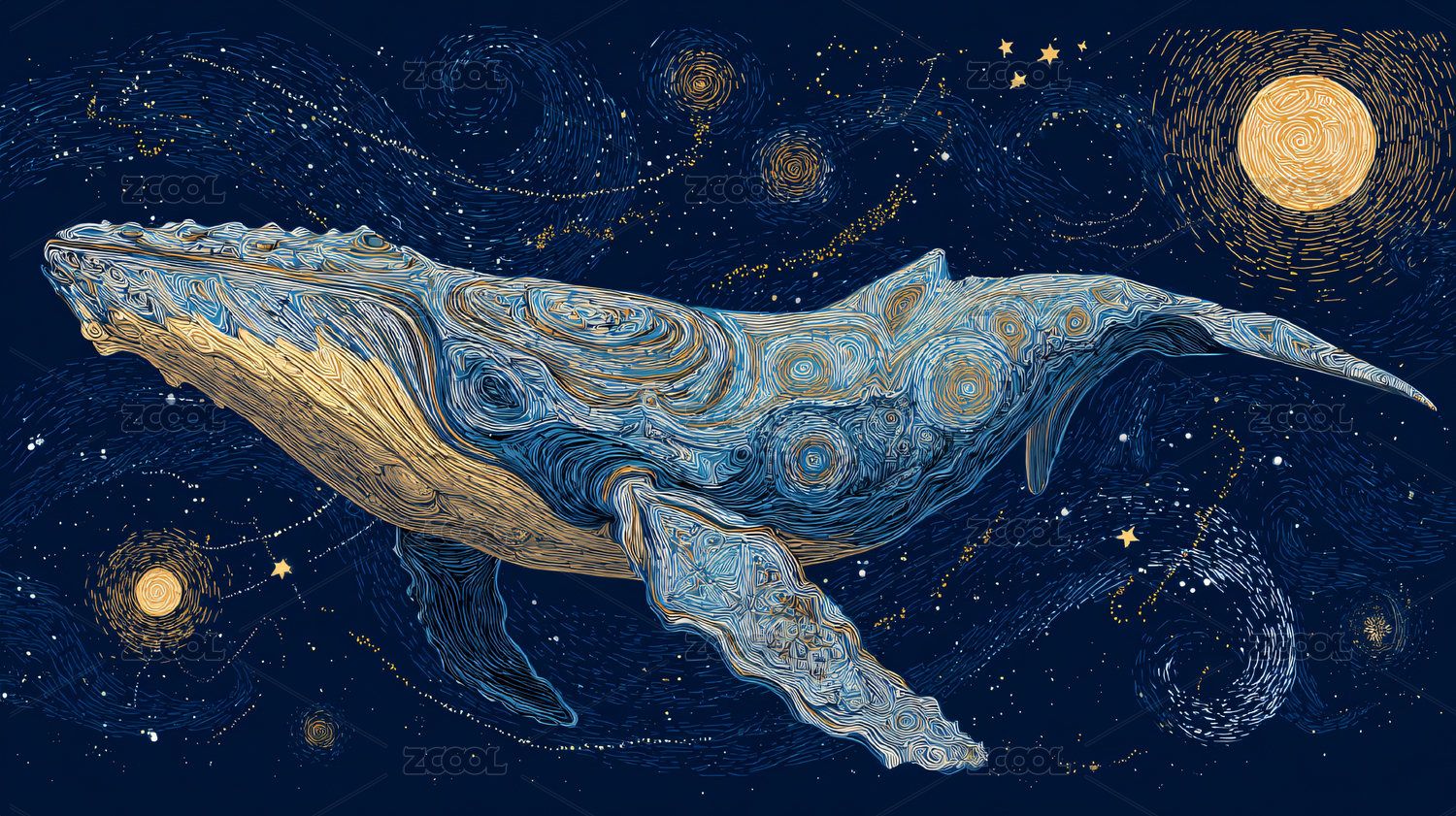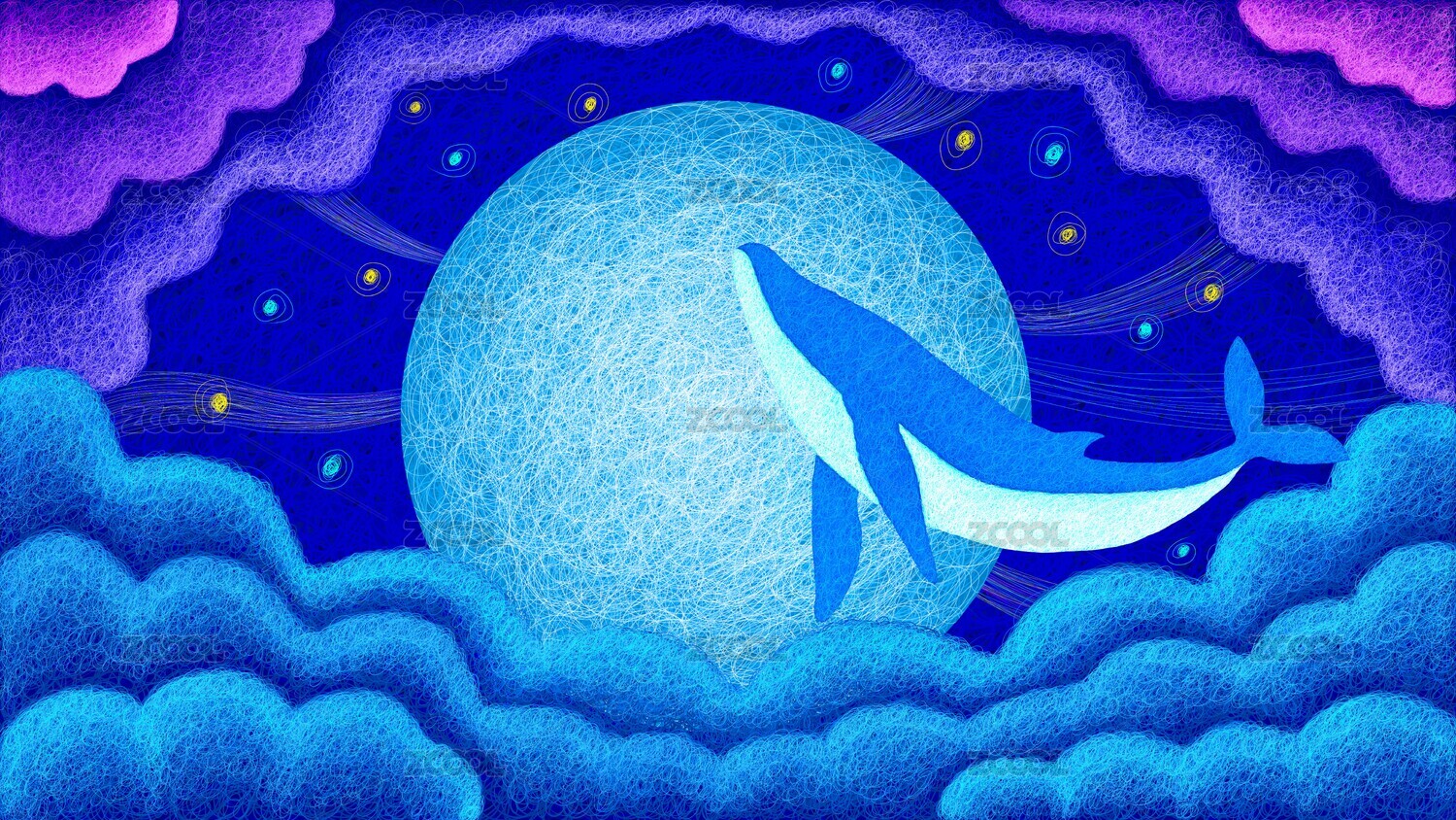 梦幻唯美线圈月球海洋生物鲸鱼手绘插画