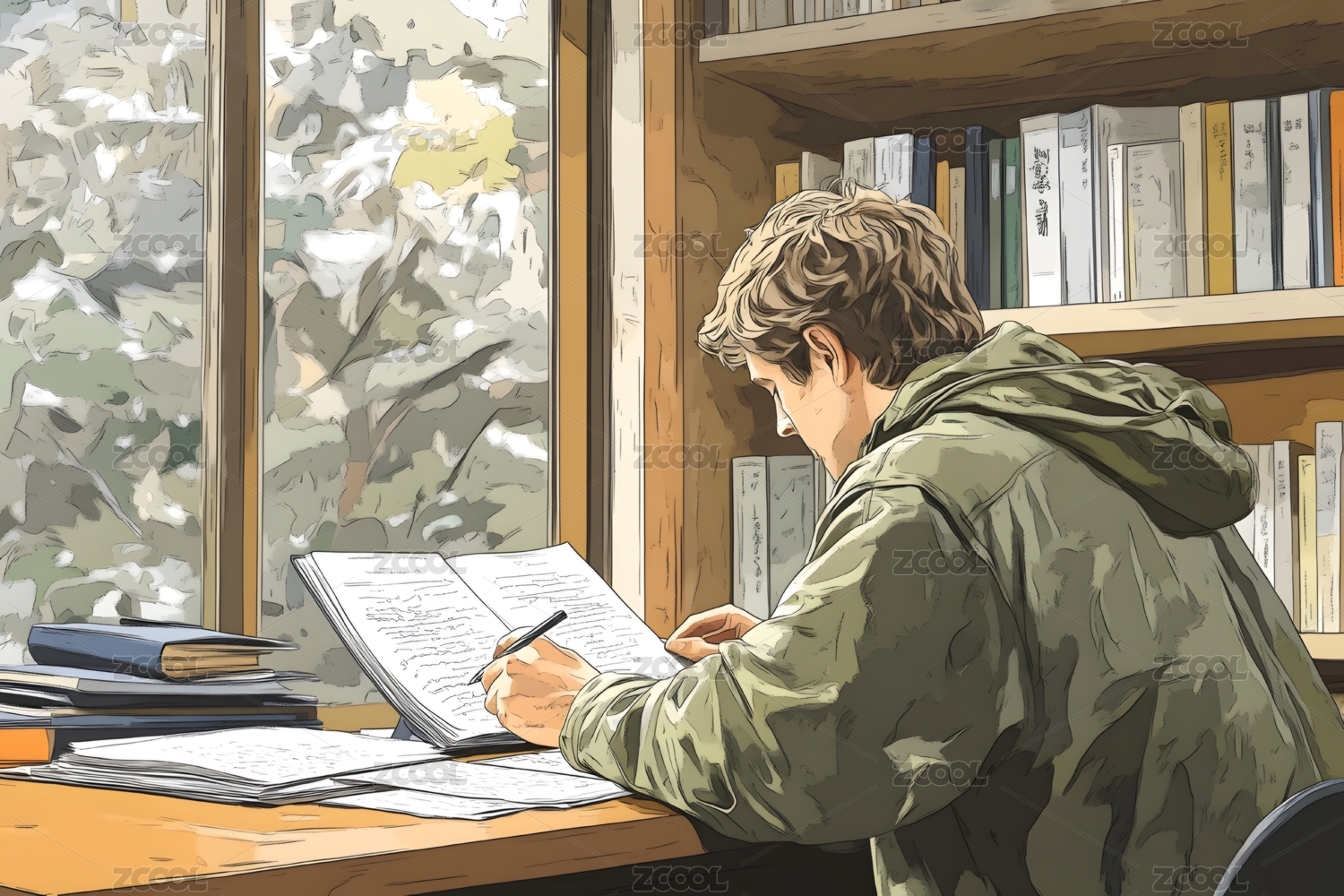 男生,男孩,年轻人,认真,努力,大学生,图书馆,刻苦,学习,插画
