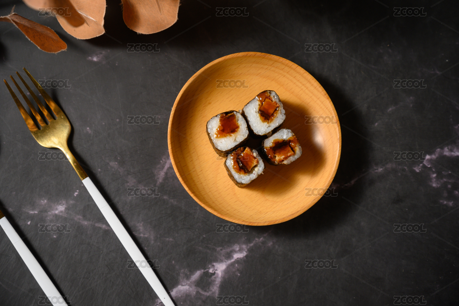 桌面上的盘子里的美味可口的吞拿鱼小卷