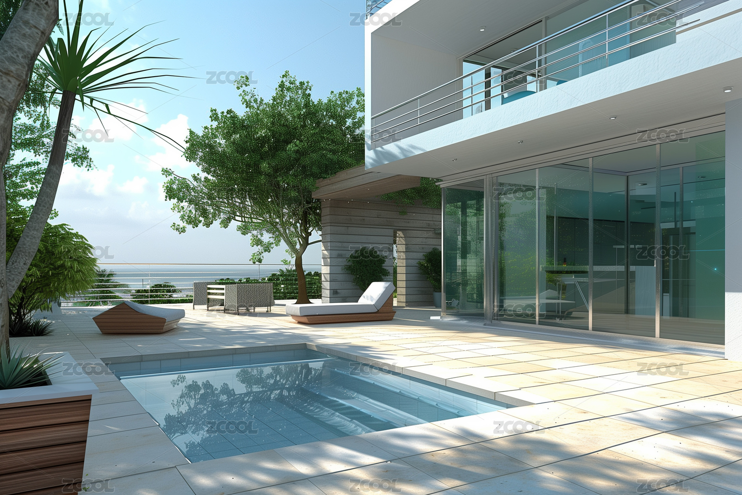 阳台,海景,躺椅,植物,阳光,户外,休闲,建筑