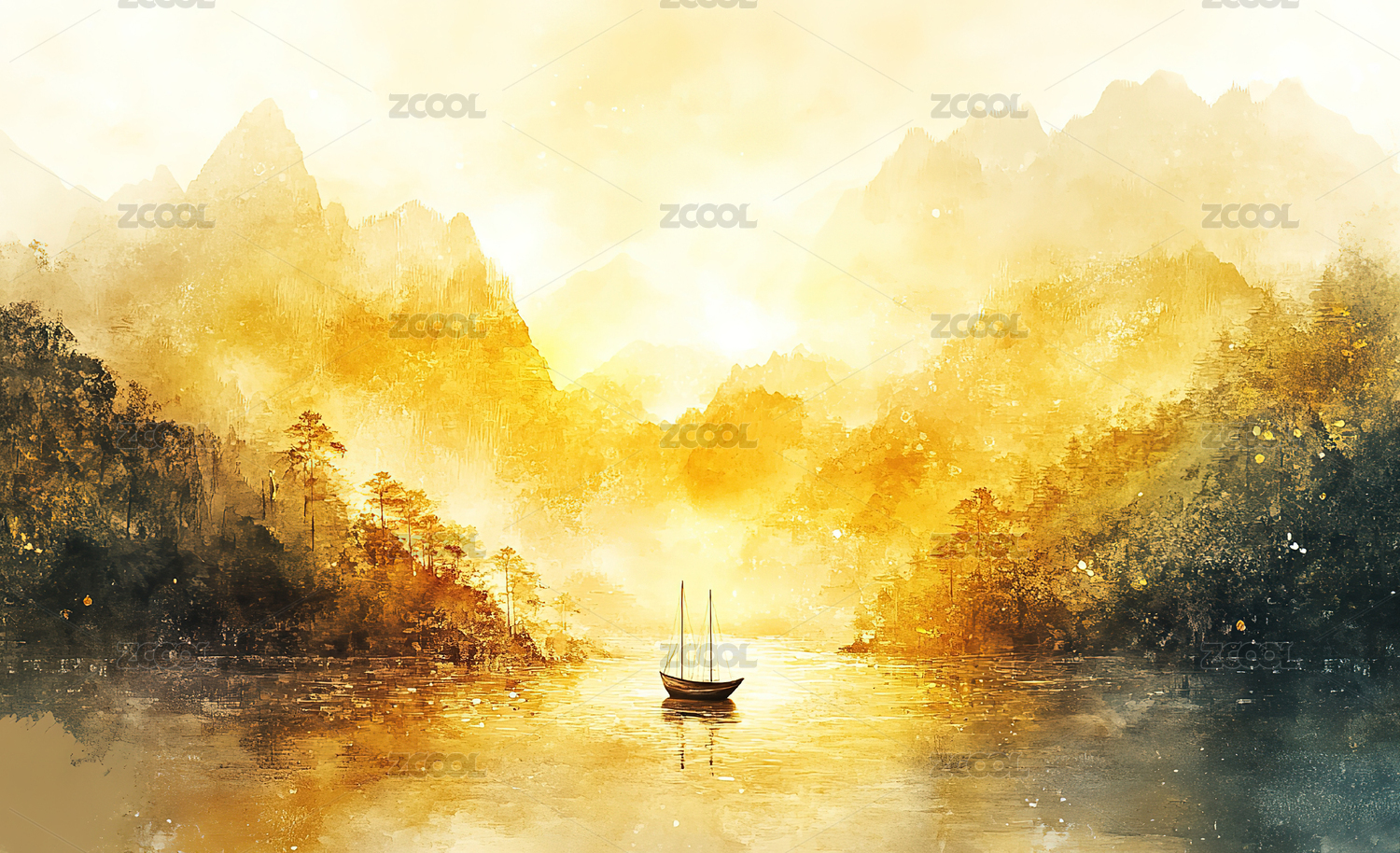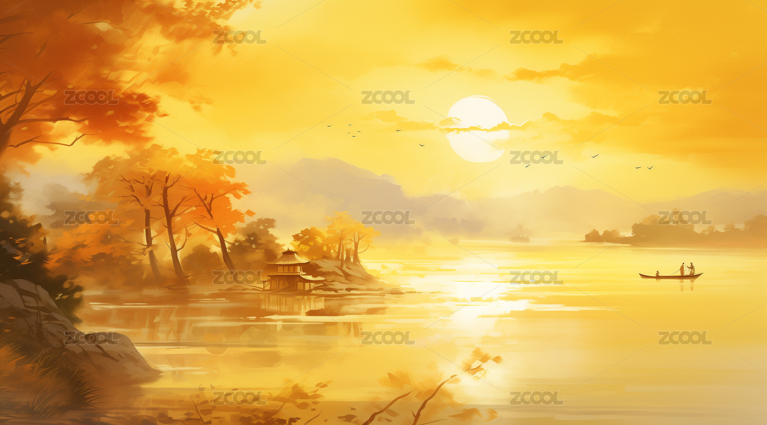 山水,风景画,山峰,河流,小船,绿树,树木,郁郁葱葱,天空,橙黄色