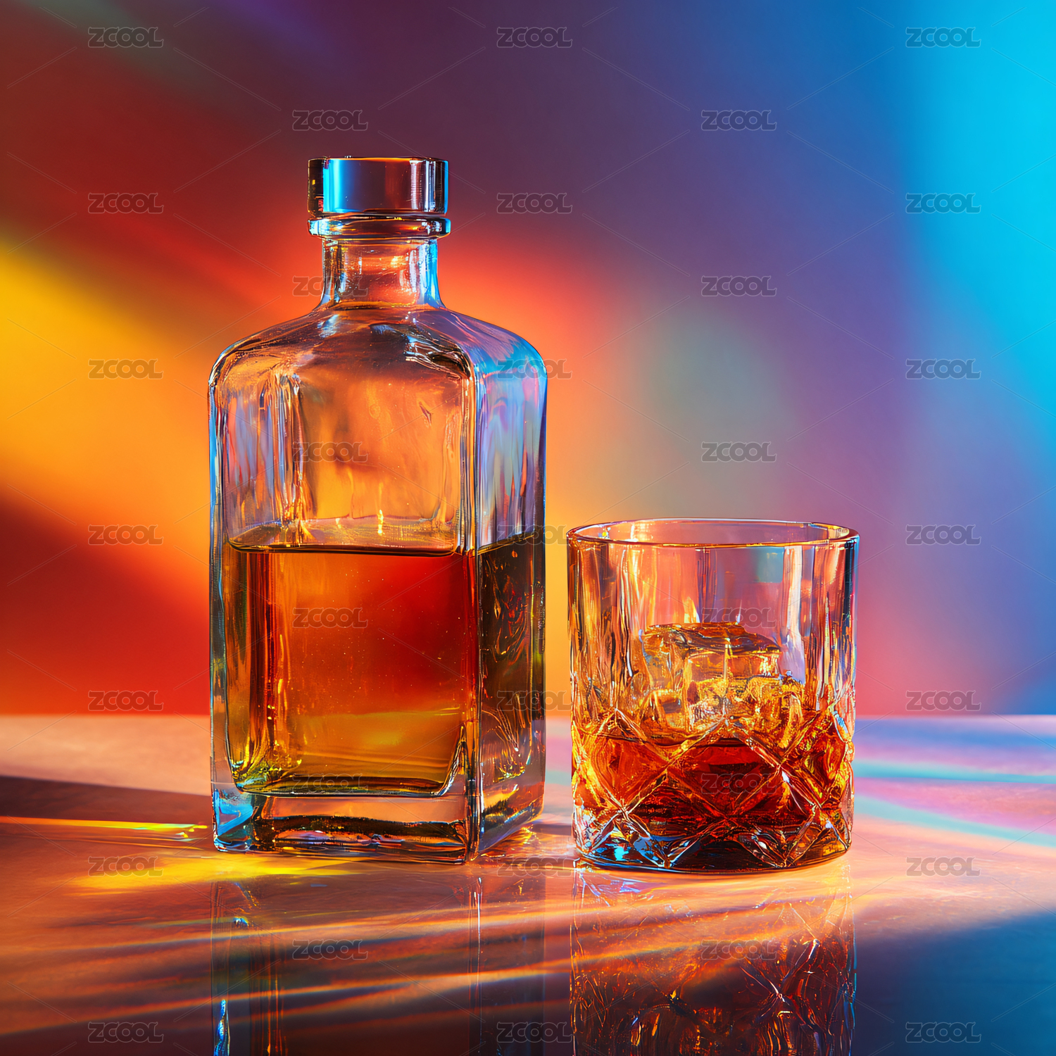 优雅的威士忌酒瓶与玻璃杯,琥珀色的酒液映