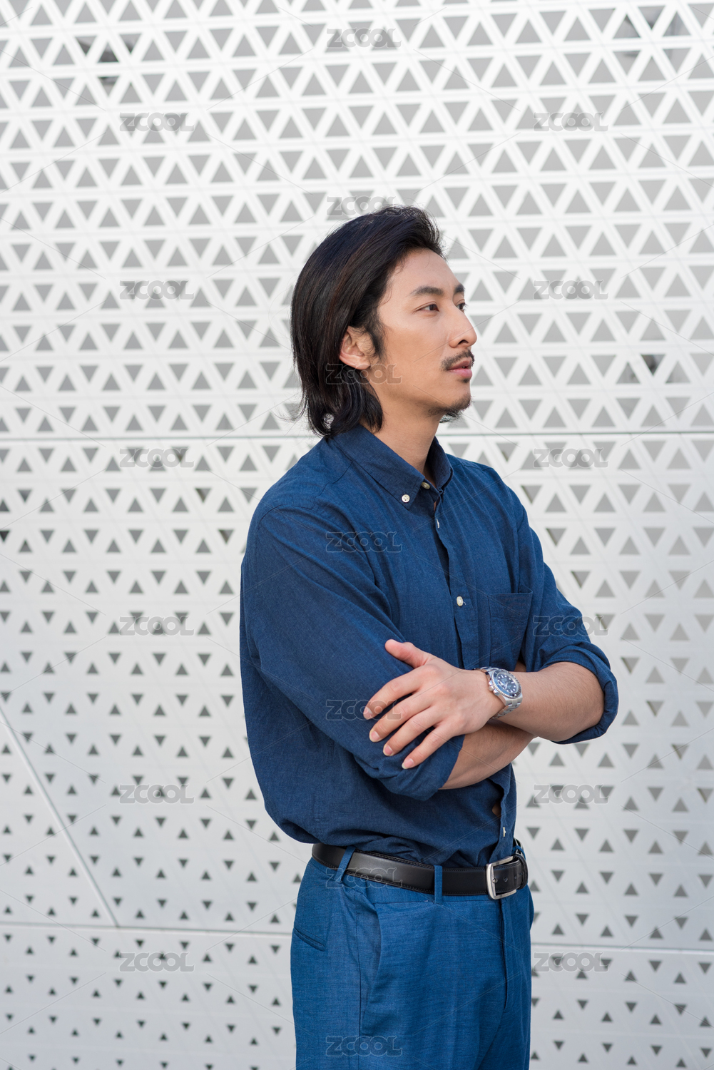 成熟的亚洲商务男士站在灰色的钢铁墙壁前