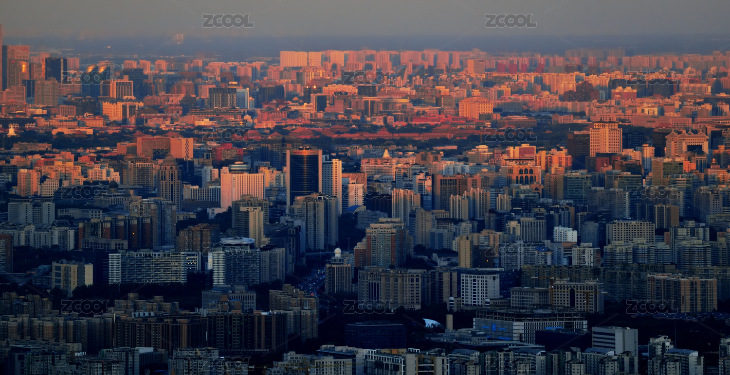 远眺晚霞中淹没在周边建筑群的北京故宫