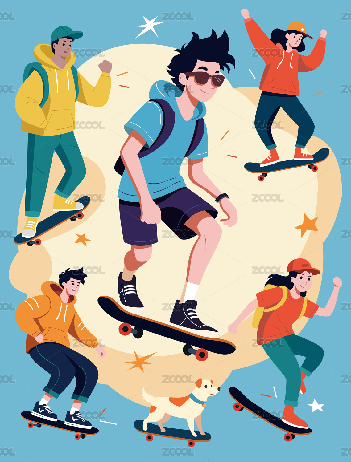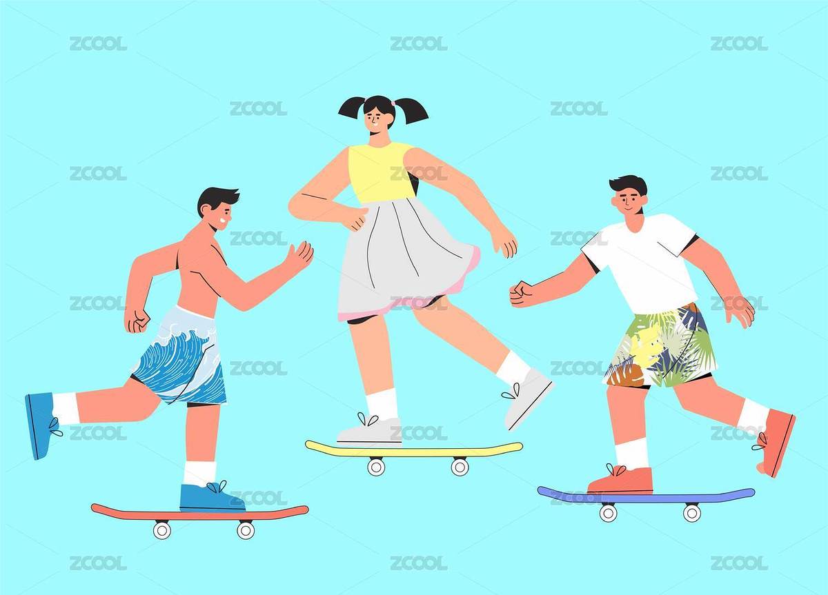 滑板青年们玩滑板往前冲运动潮人插画