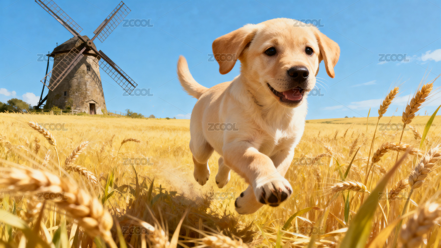 小狗奔跑麦田风车