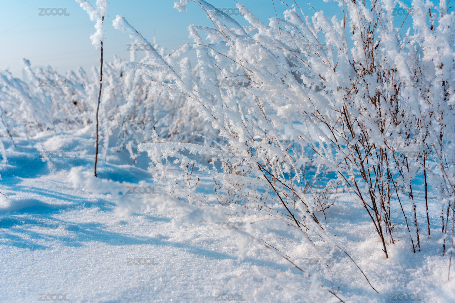 寒冷冬天雪后郊外野草上的霜冻,自然风景背