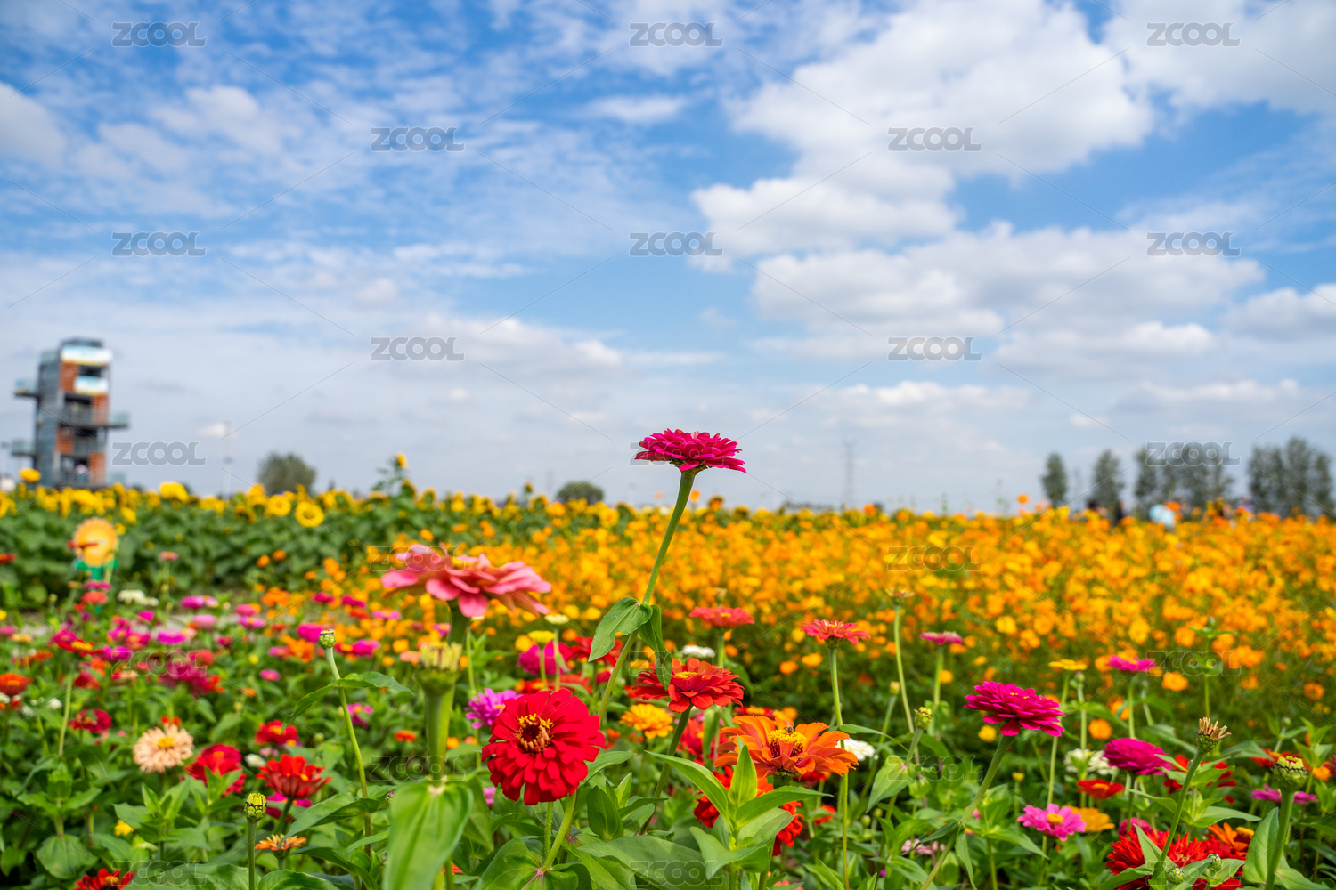 蓝天白云下的百日菊花海