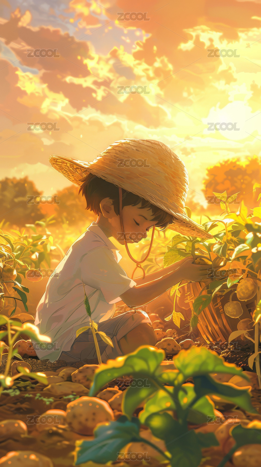 秋天芒种小满丰收男孩小麦插画风背景