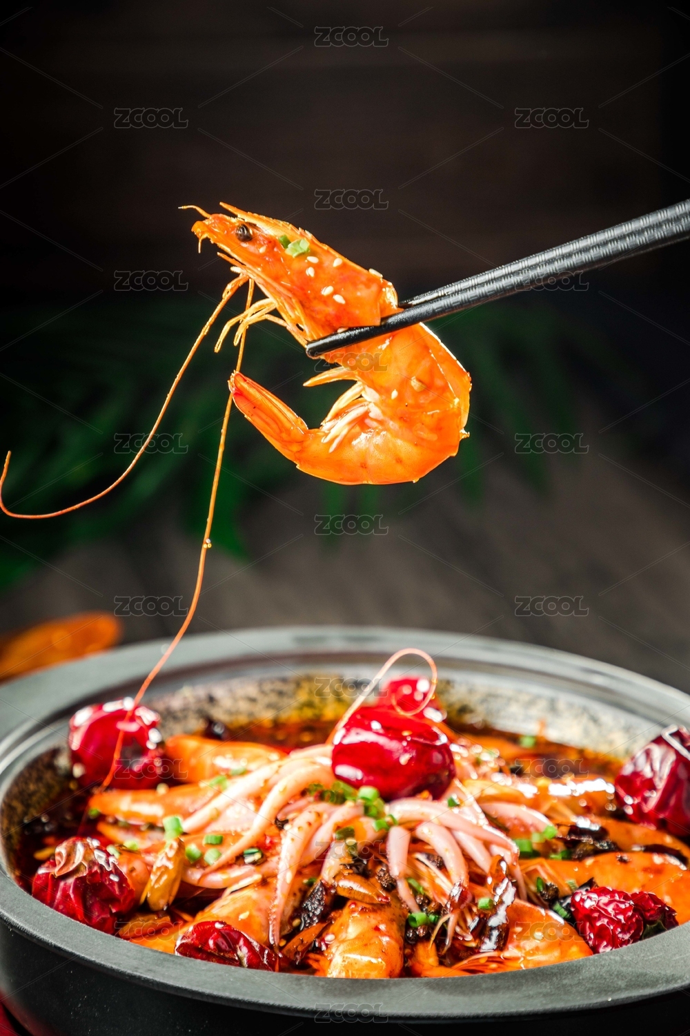 铁盆里的灯笼椒红油大虾鱿鱼须