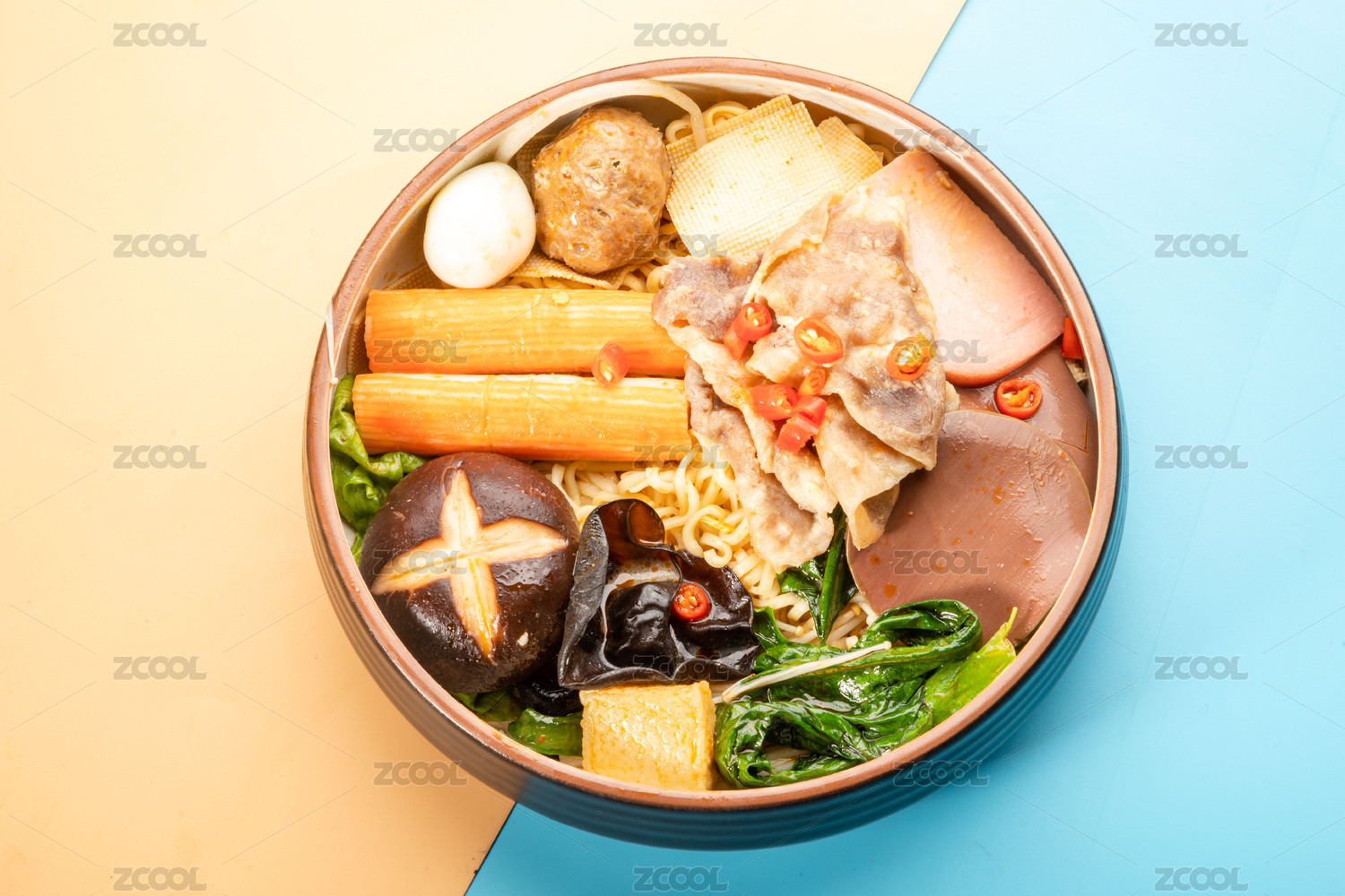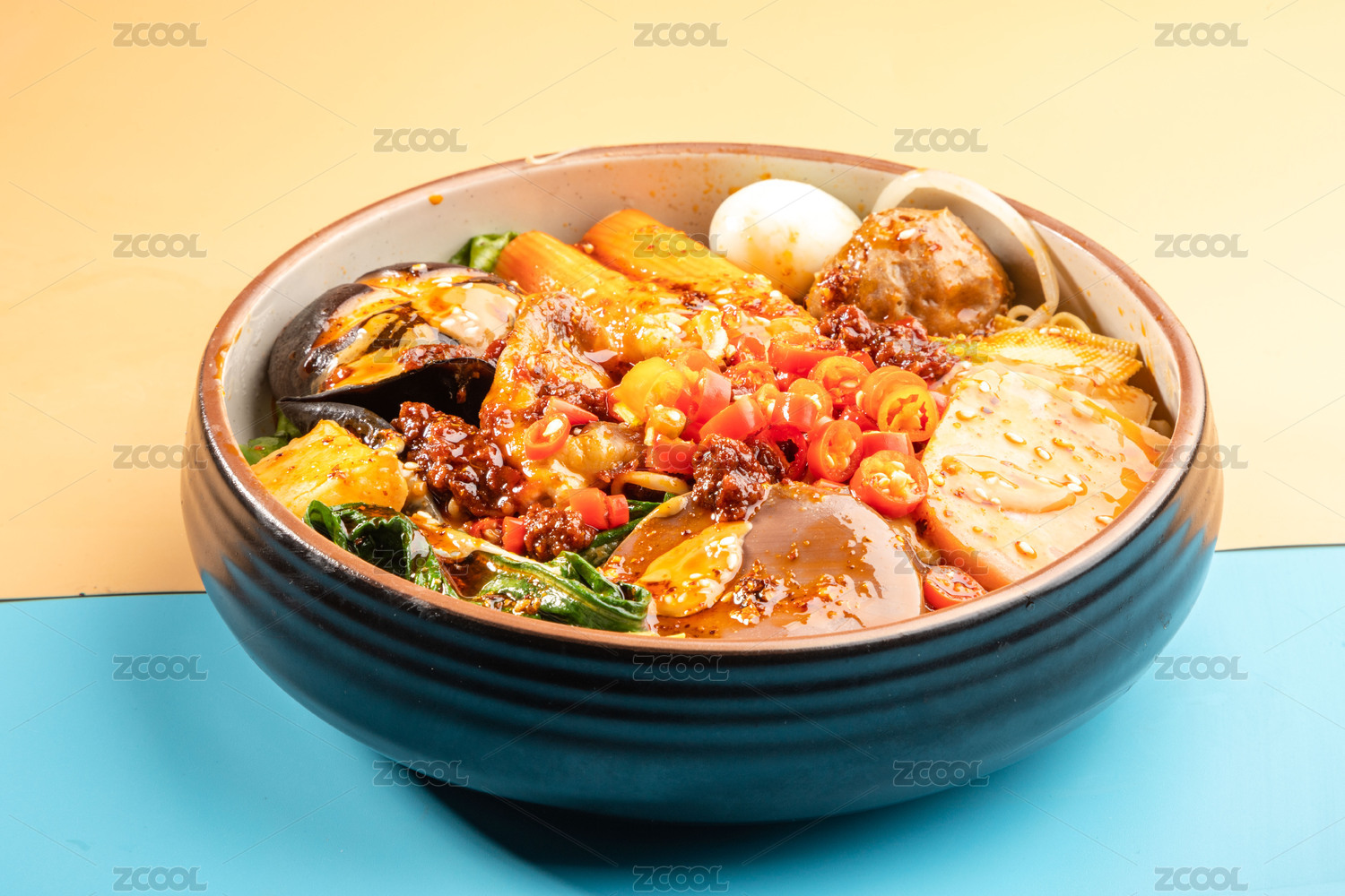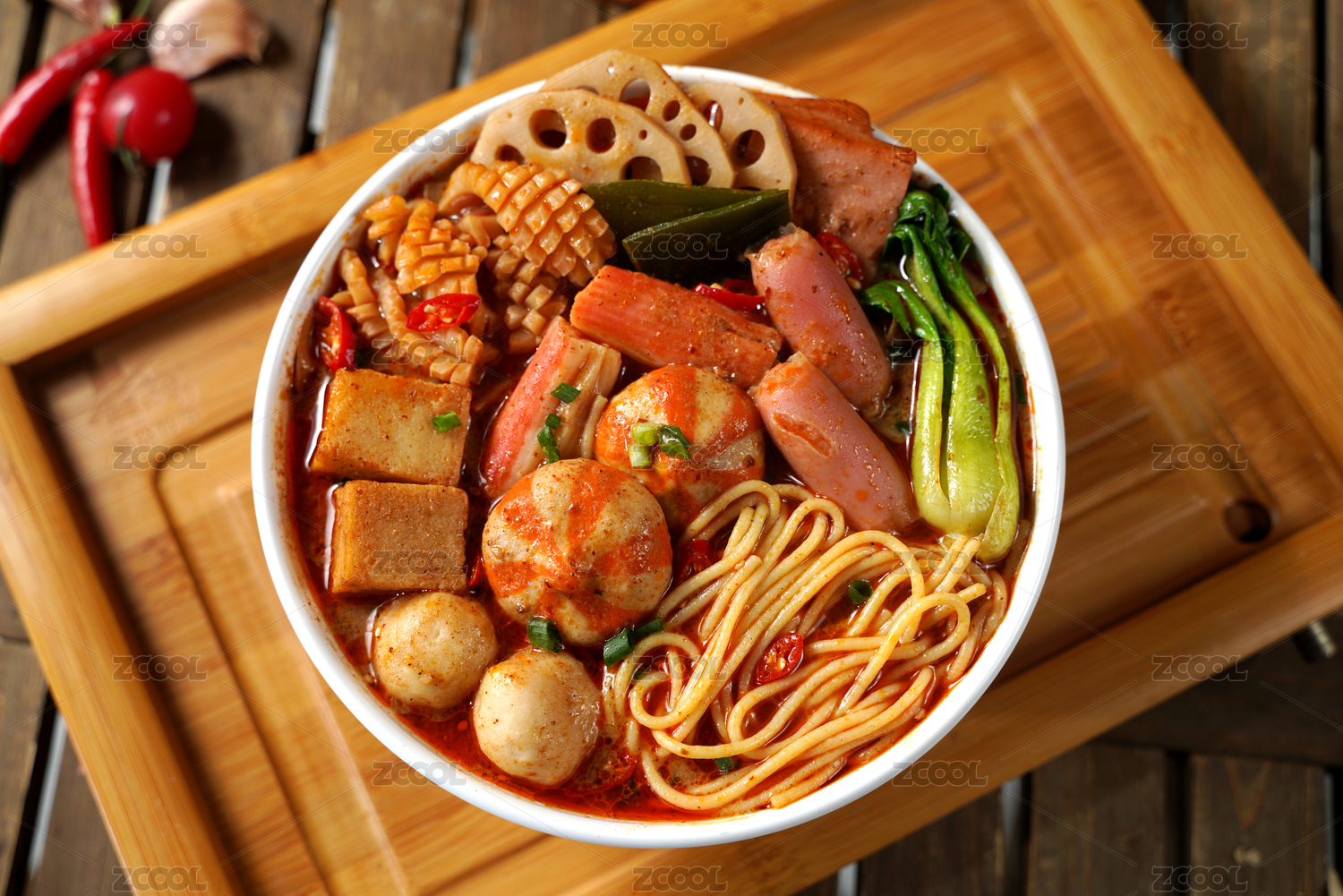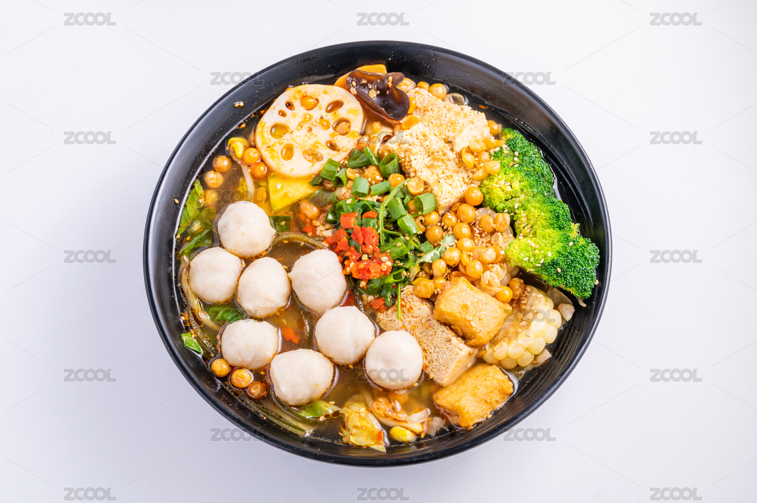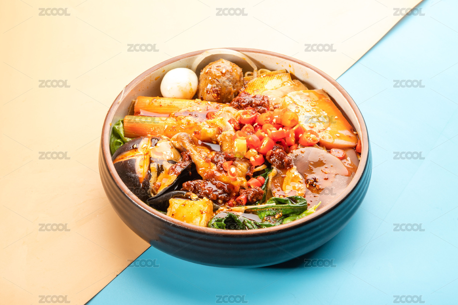 卡纸,彩色,纯色底,麻辣烫,涮菜,生菜,木勺,鲜花,菜谱,辣椒
