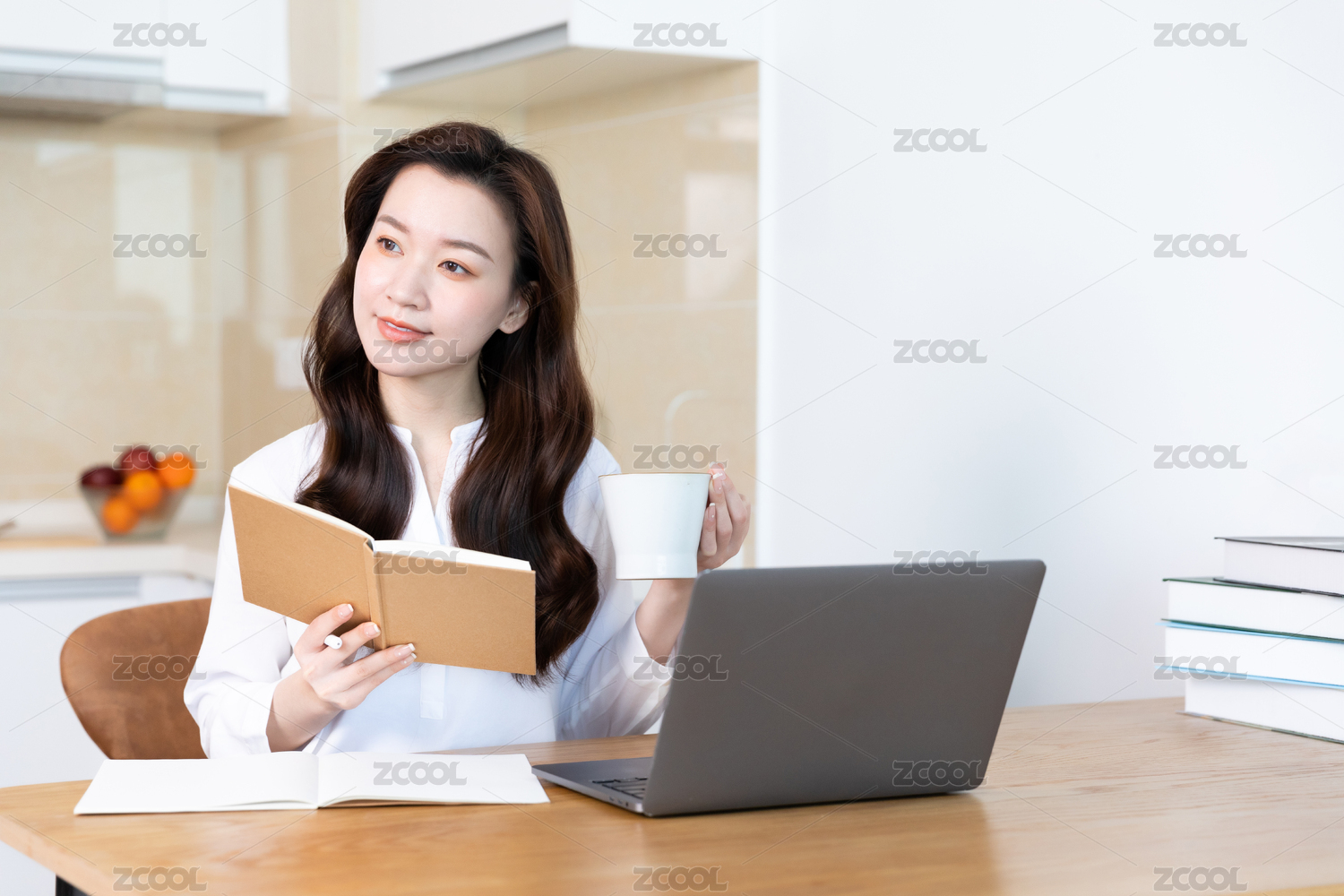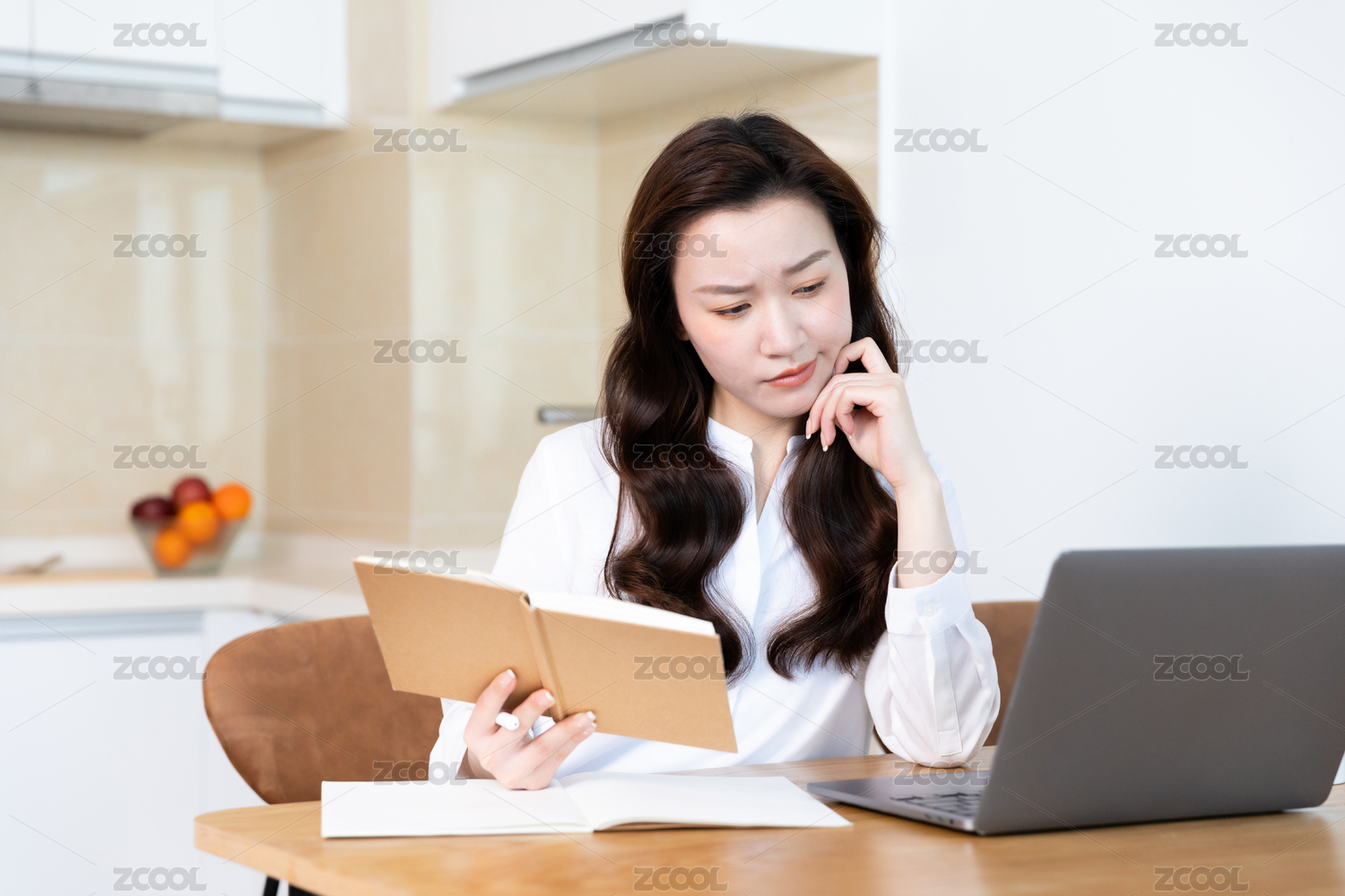 长发女性拿着书坐在电脑前