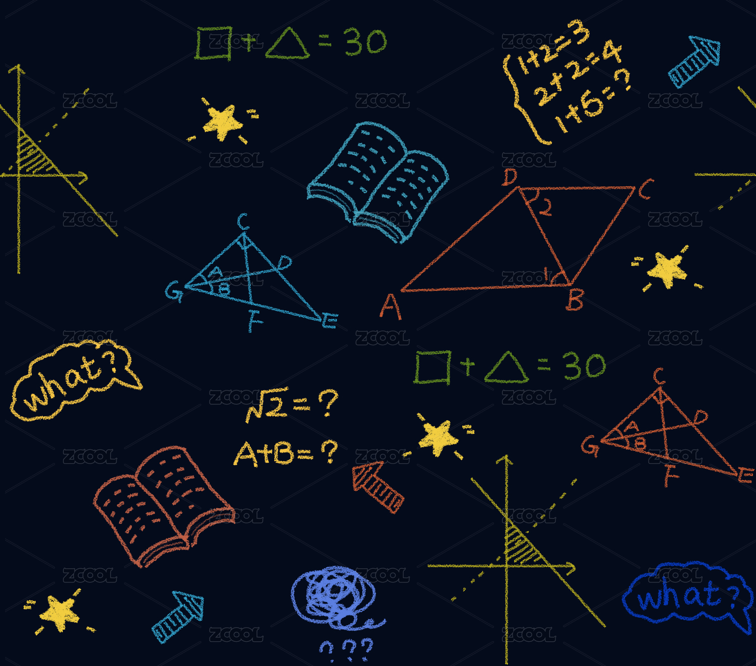 手绘数学几何图形和阿拉伯数字等元素组成的底纹,黑色背景