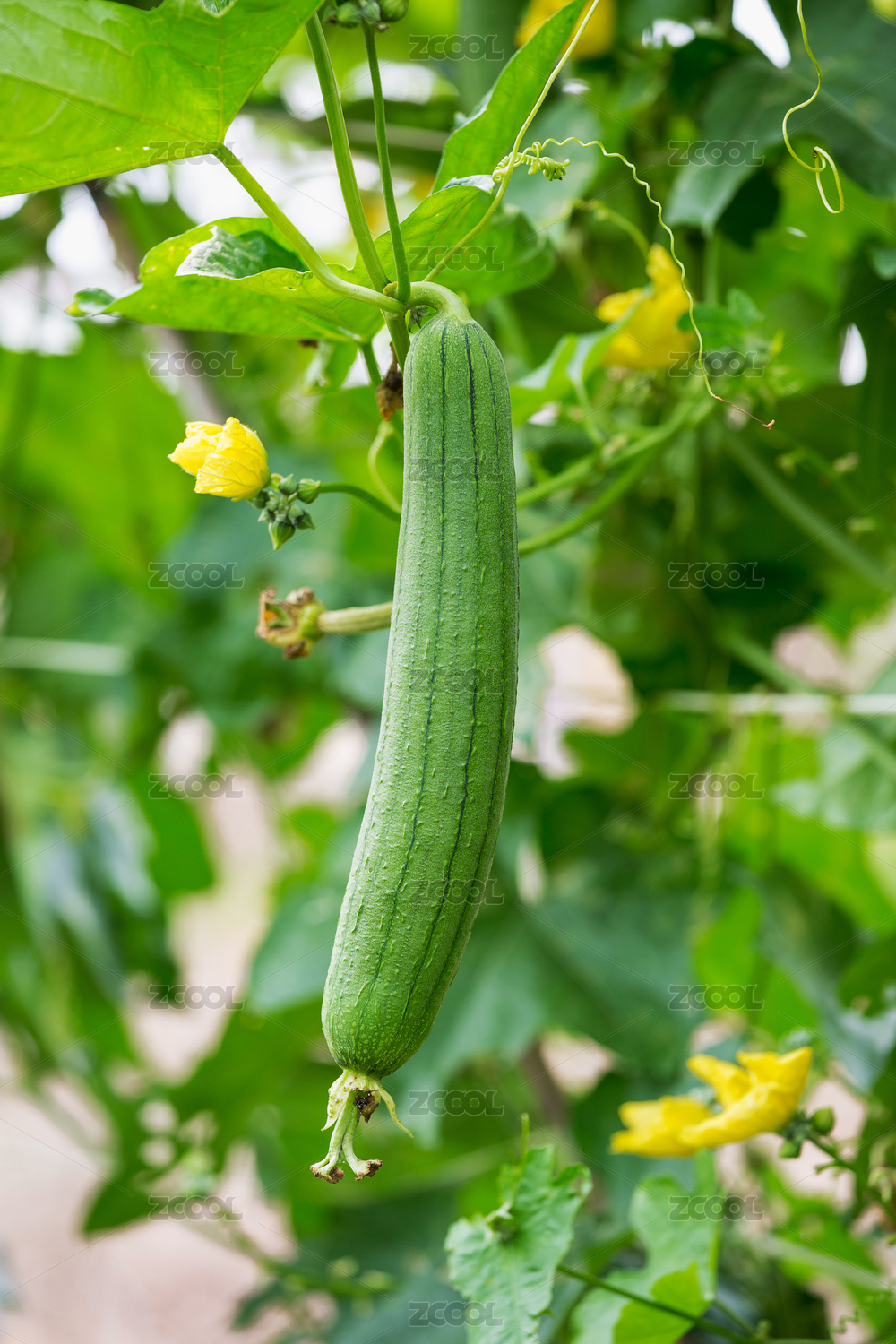 瓜藤上垂吊着的新鲜丝瓜