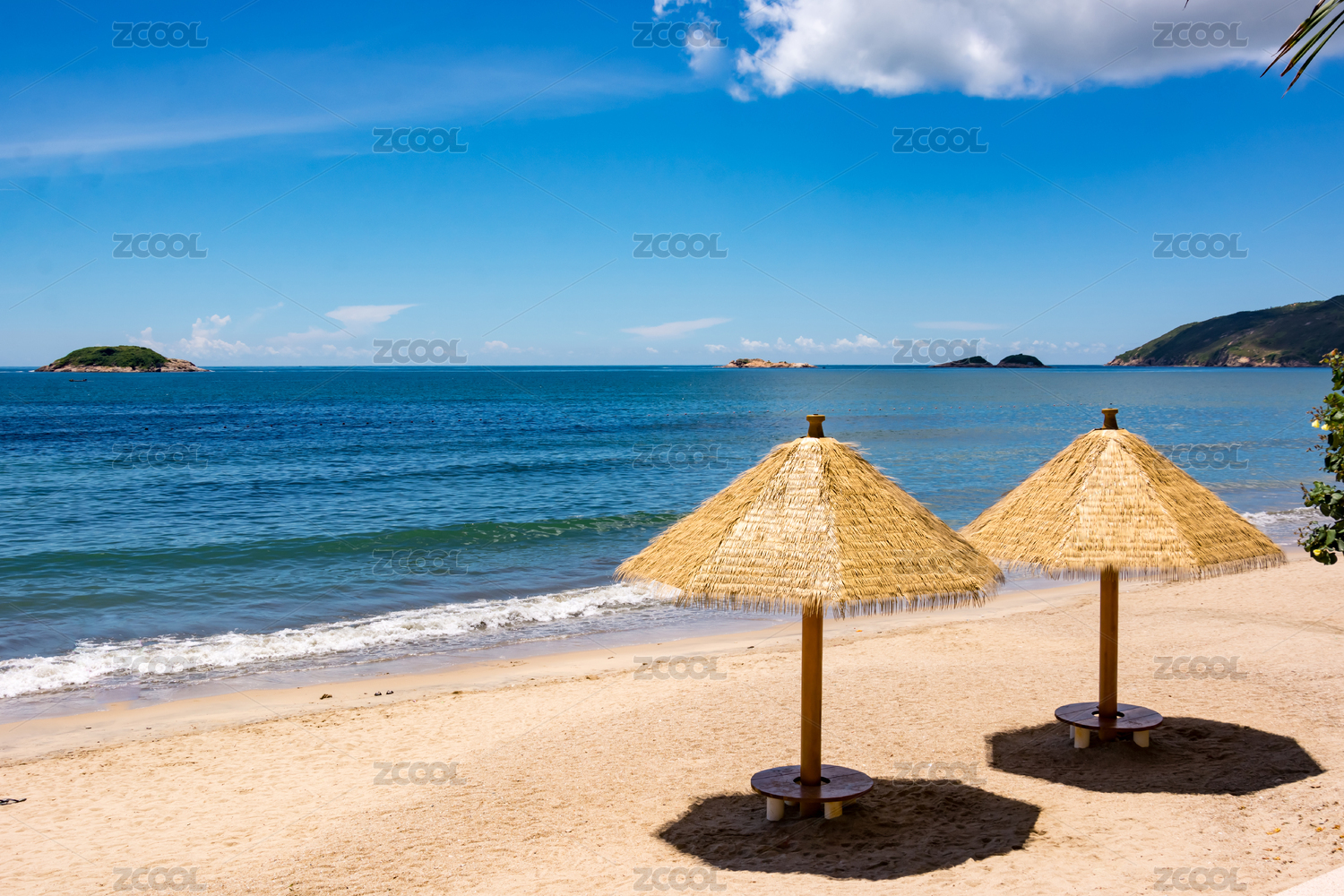 海南陵水呆呆岛沙滩上的两把沙滩伞