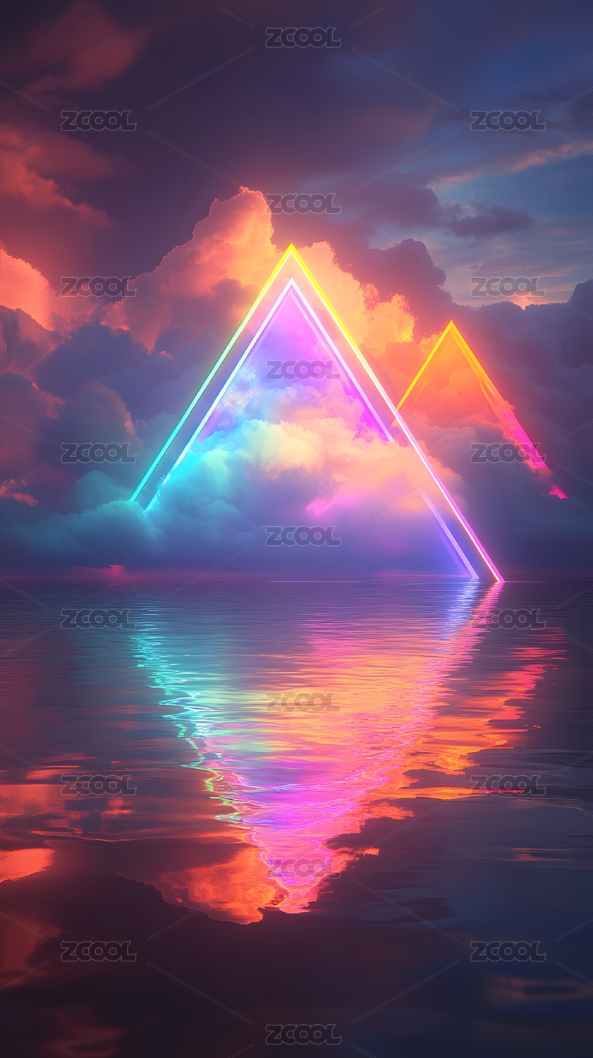 湖泊上云中彩虹色三角形发光霓虹灯与倒影