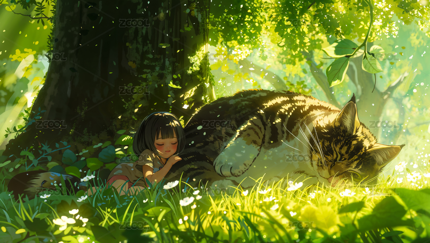 治愈系风景夏日女孩和巨大的猫在树下休息