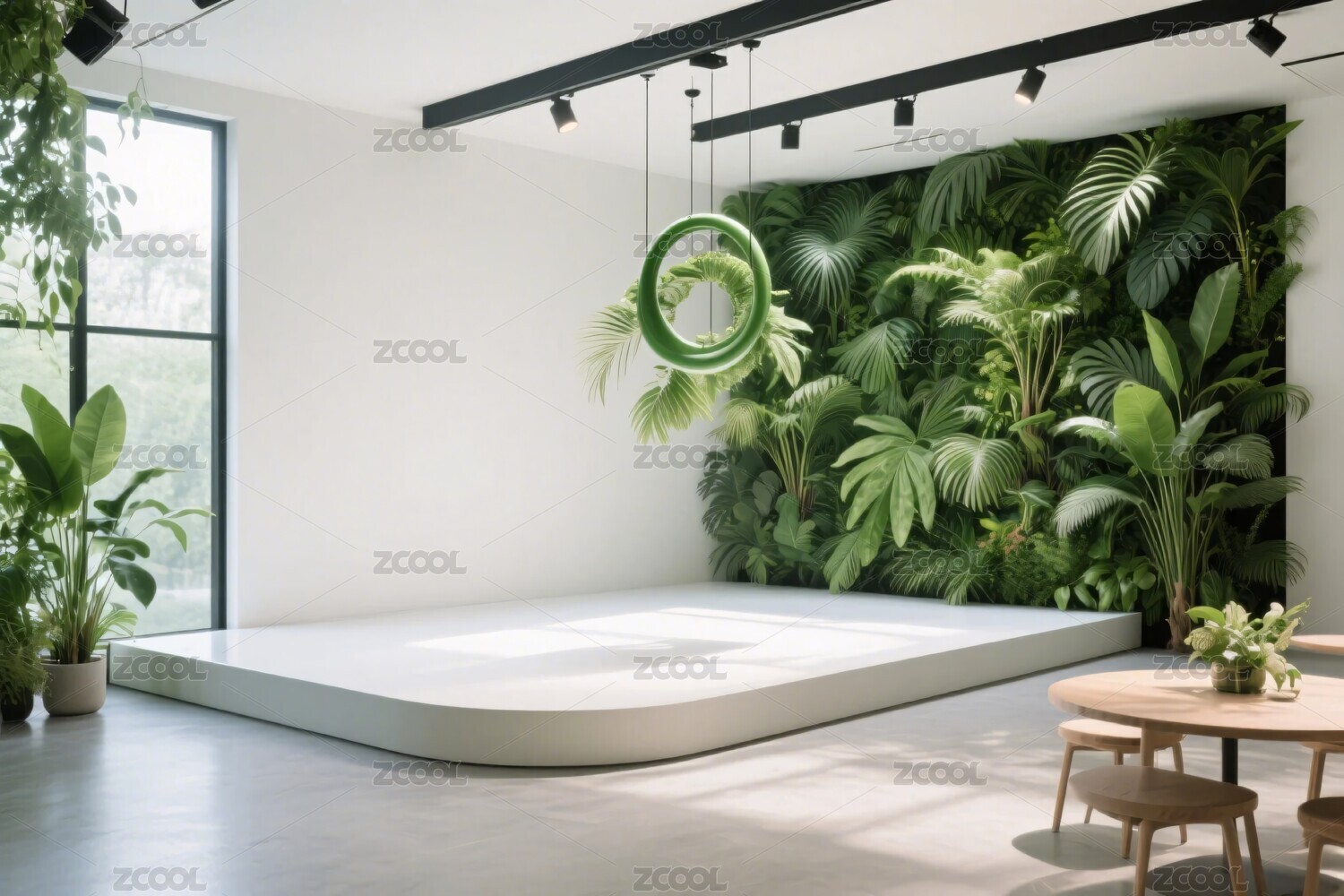 室内圆形舞台与绿色植物背景主题