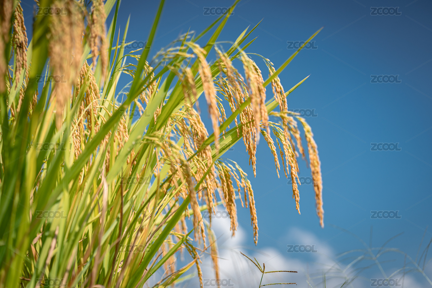 蓝天背景前沉甸甸的成熟稻穗