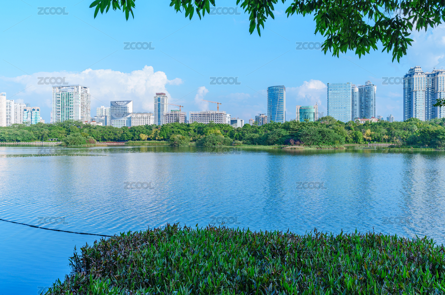南宁南湖公园蓝天白云与城市摩天大楼建筑